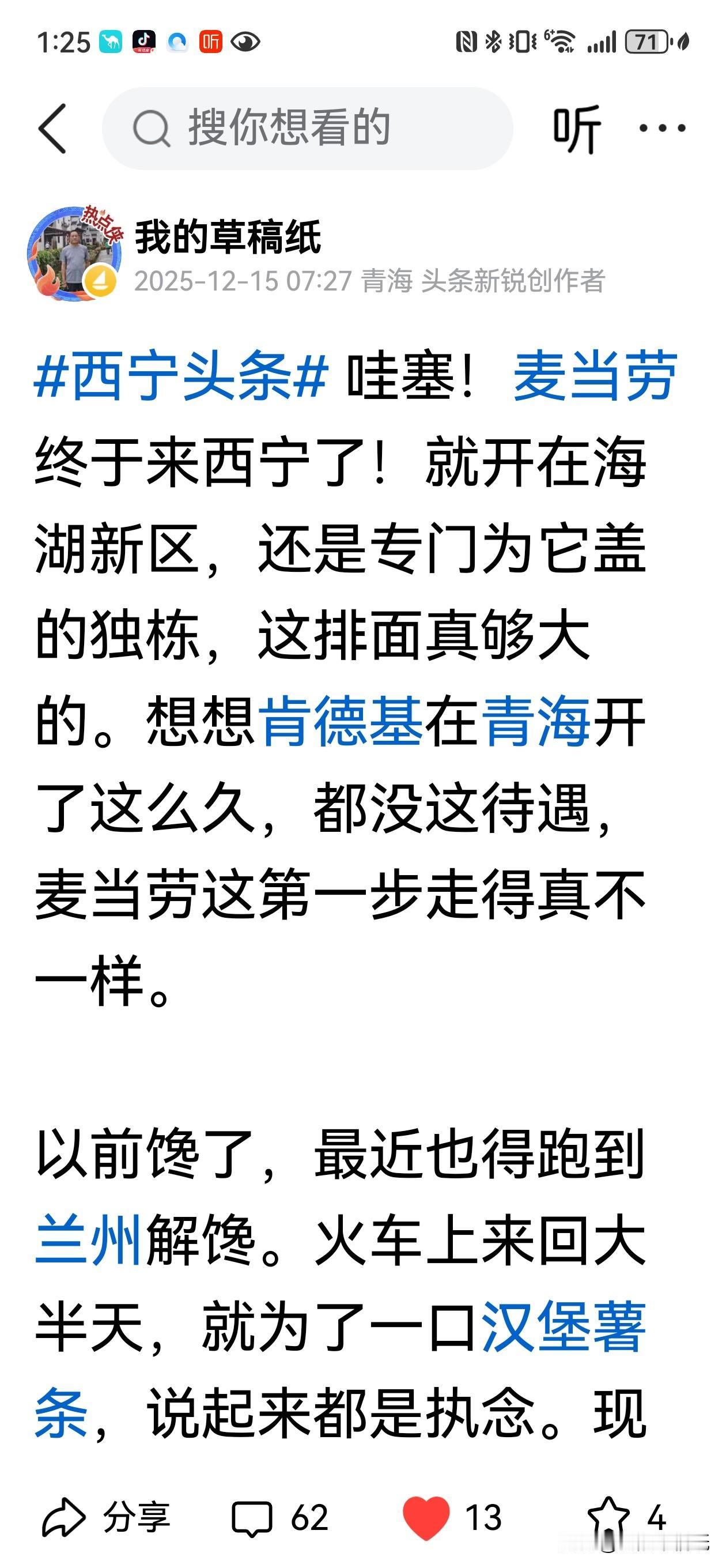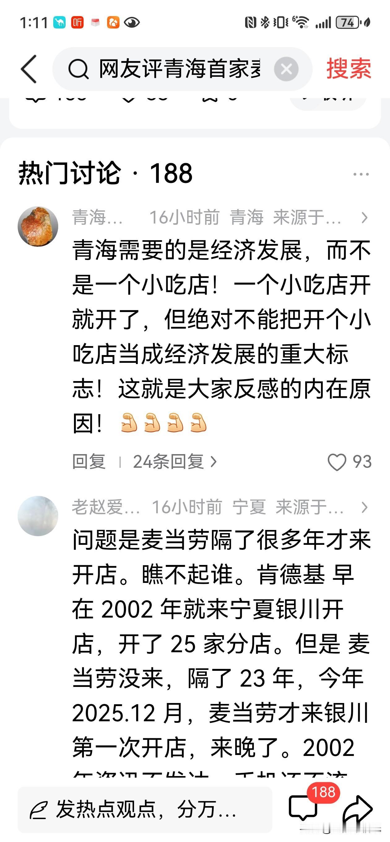 前几天我写了篇“麦当劳来西宁了”,评论区炸了。说不就一快餐店吗,值得这么炫耀吗? 答案无语,不是没人去,是没人想被当成“被施舍的消费者”。 那天我站在海湖新区的队伍里,身后是举着手机拍“首店打卡”的年轻人,前面是拎着炕锅牦牛肉饼的阿姨——她回头冲我笑:“这玩意儿,吃一次新鲜,吃三次,不如我锅里那块肉香。” 我们不是讨厌麦当劳,是讨厌它被捧成“城市进步的勋章”。 2002年肯德基来,我们排队是因为没见过汉堡长啥样;2025年麦当劳来,我们排队是因为朋友圈缺一张“我也在国际化”的照片。可谁真指望靠一个汉堡,改变西宁的冬天? 牛羊肉吃腻了?当然可以换口味。但换的,不该是“被安排的洋快餐”,而是自己选的、有温度的多元。 巷子口那家炕锅三文鱼,老板会问你“辣度要几成”;麦当劳的薯条,永远是“标准温度、标准时间、标准微笑”。 我们不是排外,我们只是不想让自己的胃,变成别人眼里的“消费指标”。 麦当劳来了,挺好。但别指望它代表西宁的未来——西宁的胃,早就在炕锅的热气里,自己长出了方向。 冬日生活打卡季