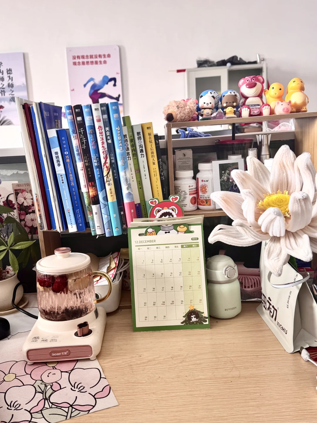 我还在办公室买了一个置物架,里面摆满了零食。然后把办公桌布置成自己喜欢的样子,养一盆发财树,还放一些自己喜欢的书。没课的时候就给自己煮一壶苹果水,吃吃零食,用心去经营自己的工作和生活。[玫瑰R]