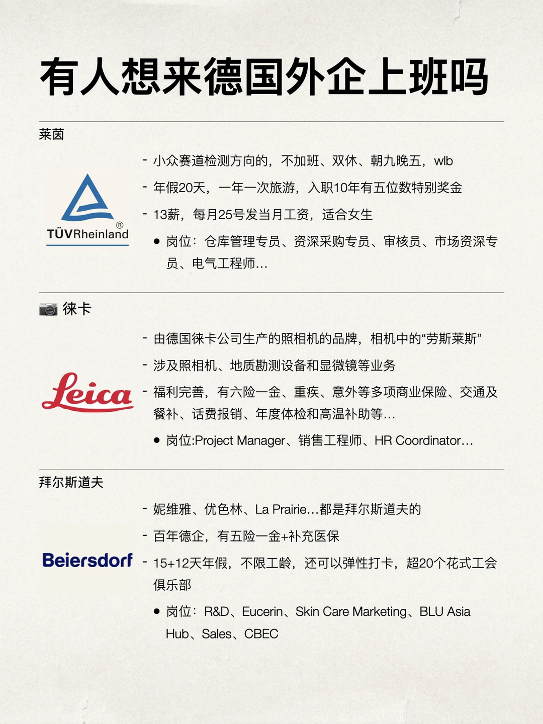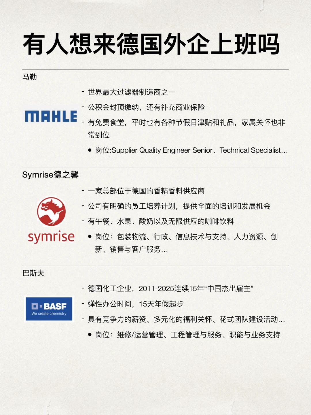 这次整理了 6 家德国外企,整体感觉就是稳、松弛、各方面都香。德国公司真的边界感很强,工作时间就是工作,下班就是下班,人文关怀也很好,真的可以实现wlb