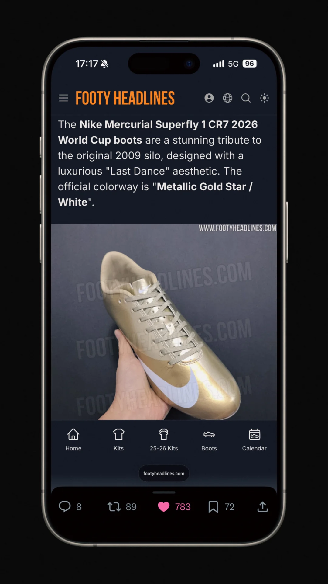 🔷 干净的白色飞翼标志与金色形成鲜明对比。鞋跟处有特别的“CR7 Mercurial”标志,彰显了其作为签名款的身份。为确保顶级性能,耐克将复古鞋面与现代的 Mercurial Vapor 16 鞋底相结合。鞋底采用了惊艳的金属金色镀铬效果。
