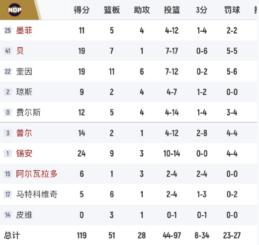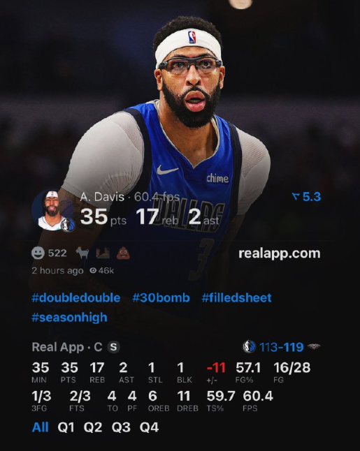 鹈鹕逆转独行侠取得5连胜,浓眉出战35分钟,28投16中,三分3中1,空砍35分17板2抢断1盖帽。