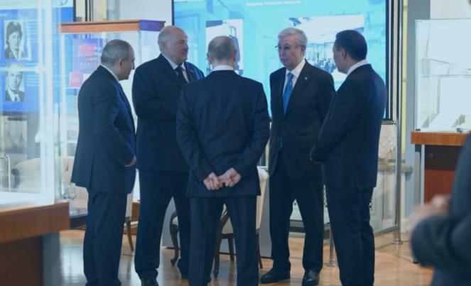12月22日,普京背手而立,与刚从日本赶来的哈萨克斯坦总统、吉尔吉斯斯坦总统聊得