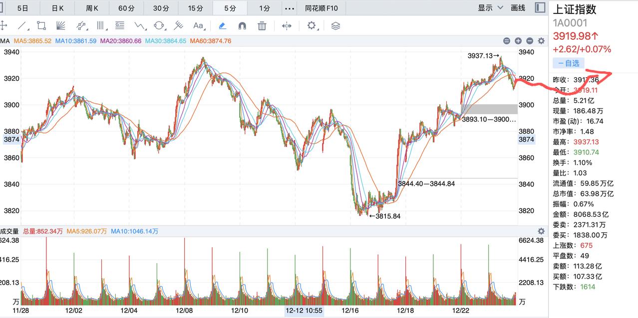 当心明天大盘继续回调3900点!今天的走势很伤人,3000多个股下跌,大盘指数虽然是红的,但是盘面冷得让人心慌!这就是12月份的常态,3900点应该是12月底需要夯实的平台,如果这个平台不能站稳,看得再高也是枉然! 今天贵金属和电池走强是大盘走红的关键,光模块和ai走强就让人看不懂了,这两个板块走强很难理解,不理解就不要去碰,年底还是希望大消费、医药板块有所表现!