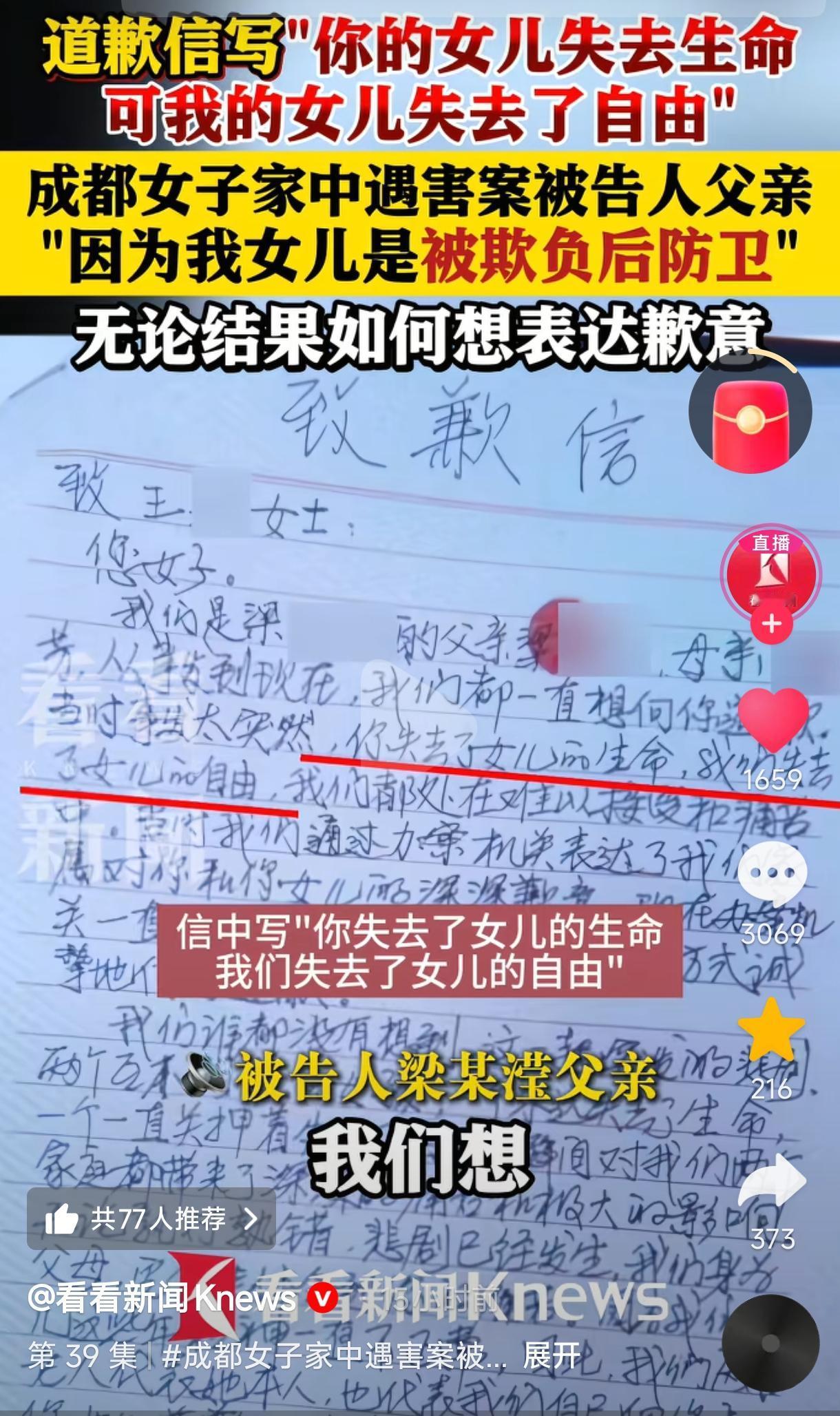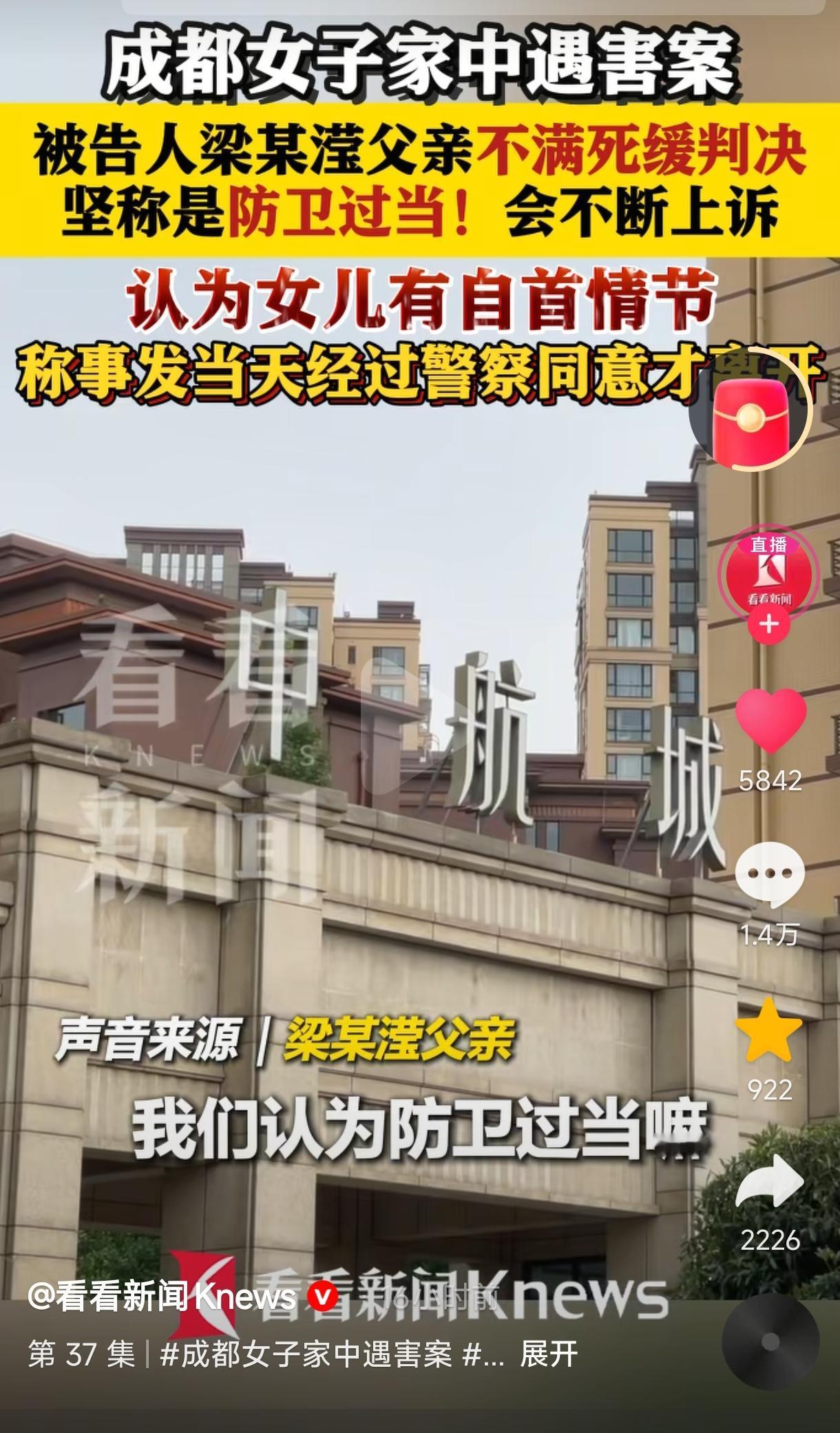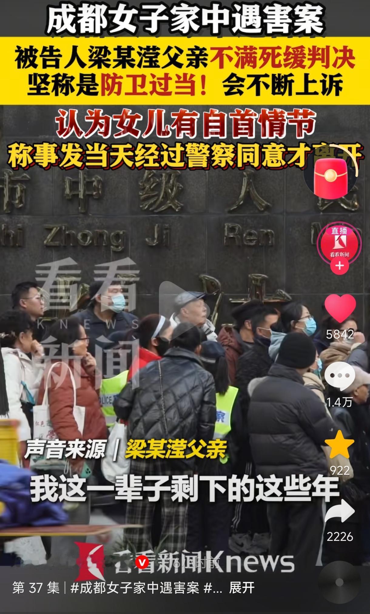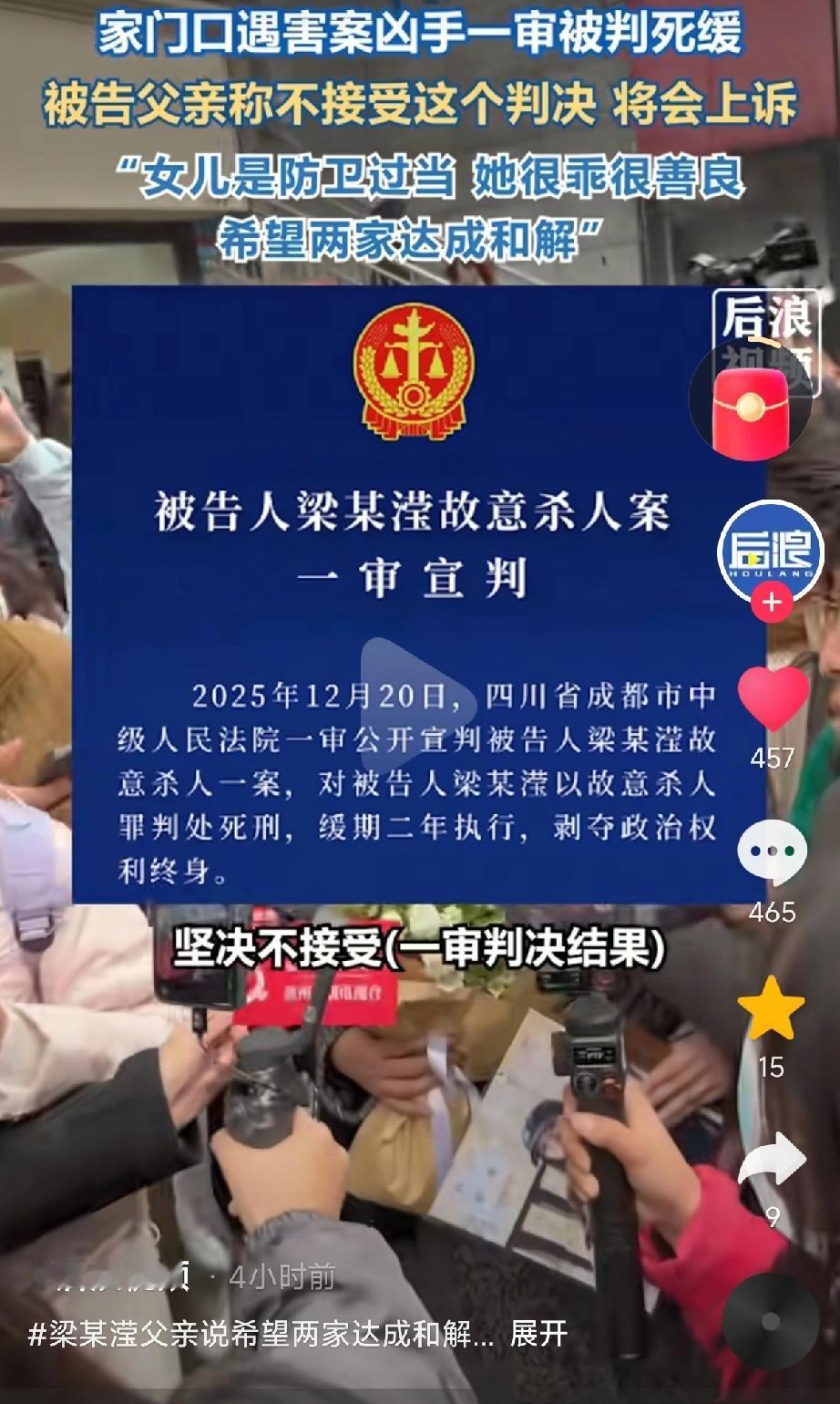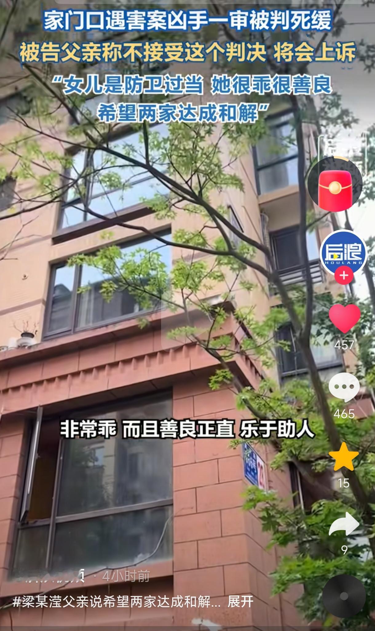 梁柯莹的父亲对媒体称,女儿是正当防卫,从小很听话,善良正直,乐于助人,是王紫雅欺负女儿她才反抗的,还认为一审结果是舆论压力下的妥协。 其实,双方对结果都不满意,梁父在一审后三天开始频频发表言论,坚决要上诉;紫雅妈妈也坚决抗诉,如此一方认为判重了,一方又认为判轻了,开启了极限拉扯。 感觉梁父就是一个神秘的存在,他没有接受过采访,而在女儿一审被判死缓后,他终于坐不住了,在一审后三天首次接受记者采访。 梁父认为,女儿是正当防卫,还称女儿乖巧听话,善良正直,且乐于助人,并表示希望与紫雅妈妈达成和解,说他女儿以后出来生活后会帮助紫雅妈妈养老。 对于正当防卫,梁父是这样说的,说她女儿在精神分裂症情况下被王紫雅语言、行为等欺负,女儿回家时手臂、头都受伤了,属于正当反应。 还表示,一审结果与实际情况相差太远,是舆论裹挟下的妥协,不是闹得凶就这么判,他往后余生都要为这事活下去并不断进行申诉。 面对梁父的言论,真不知该如何评价了。 他说女儿是正当防卫,却绝口不提女儿入室捅人10多刀的蓄意性及刀具伤害紫雅的刀刀致命性,有携刀去敲开人家门入室行凶的正当防卫吗?要说正当防卫,受害者紫雅才是吧。 梁父可曾想过,他在字字句句为女儿辩解时,紫雅鲜活的生命早已逝去了五六百天了。你的女儿还活着,且今后很可能十多年就出来了,可人家的女儿却再也回不来了。 感觉之前梁家人没有真正对S害紫雅一事心生愧疚,甚至还对紫雅妈妈说出“你女儿失去了生命,可我女儿失去了自由”的混账话,只在女儿被判死缓了才放低了姿态想求和。 说女儿善良正直、乐于助人,不知多少人会信,还说会帮紫雅妈养老,不知紫雅妈会不会动容。而即便结局无法改变,想必紫雅妈都不想面对这一家人了吧。 感觉法律已经对梁柯莹表现了最大程度的宽容,如果再无理喊冤,这让惨死冤死在九泉之下的王紫雅何以瞑目? (来源:后浪视频等)