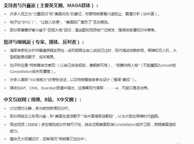 特朗普宣布新型战舰计划 让grok收集整理了一下网络上对于特朗普宣布美国海军将建造新型“Trump-class”(特朗普级)战列舰的反应。特朗普于12月22日在海湖庄园宣布,美国海军将建造新型“Trump-class”(特朗普级)战列舰,作为其“Golden Fleet”(黄金舰队)计划的核心部分。首舰名为USS Defiant(无畏号),计划先建2艘,最终目标20-25艘。这些战舰被描述为比二战Iowa级更大、更快、威力“100倍”,配备高超音速导弹、核武装海基巡航导弹、电磁轨道炮、激光武器等先进系统。网上反响非常热烈,迅速成为热点,观点两极分化。