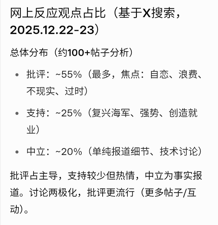特朗普宣布新型战舰计划让grok对X平台上有关美国新型战舰的帖子进行分析和归类,其中,批评:占55%(自恋、浪费、不现实、过时)支持:占25%(复兴海军、强势、创造就业)中立:占20%(单纯报道细节、技术讨论)批评占主导,支持较少但热情,中立为事实报道。