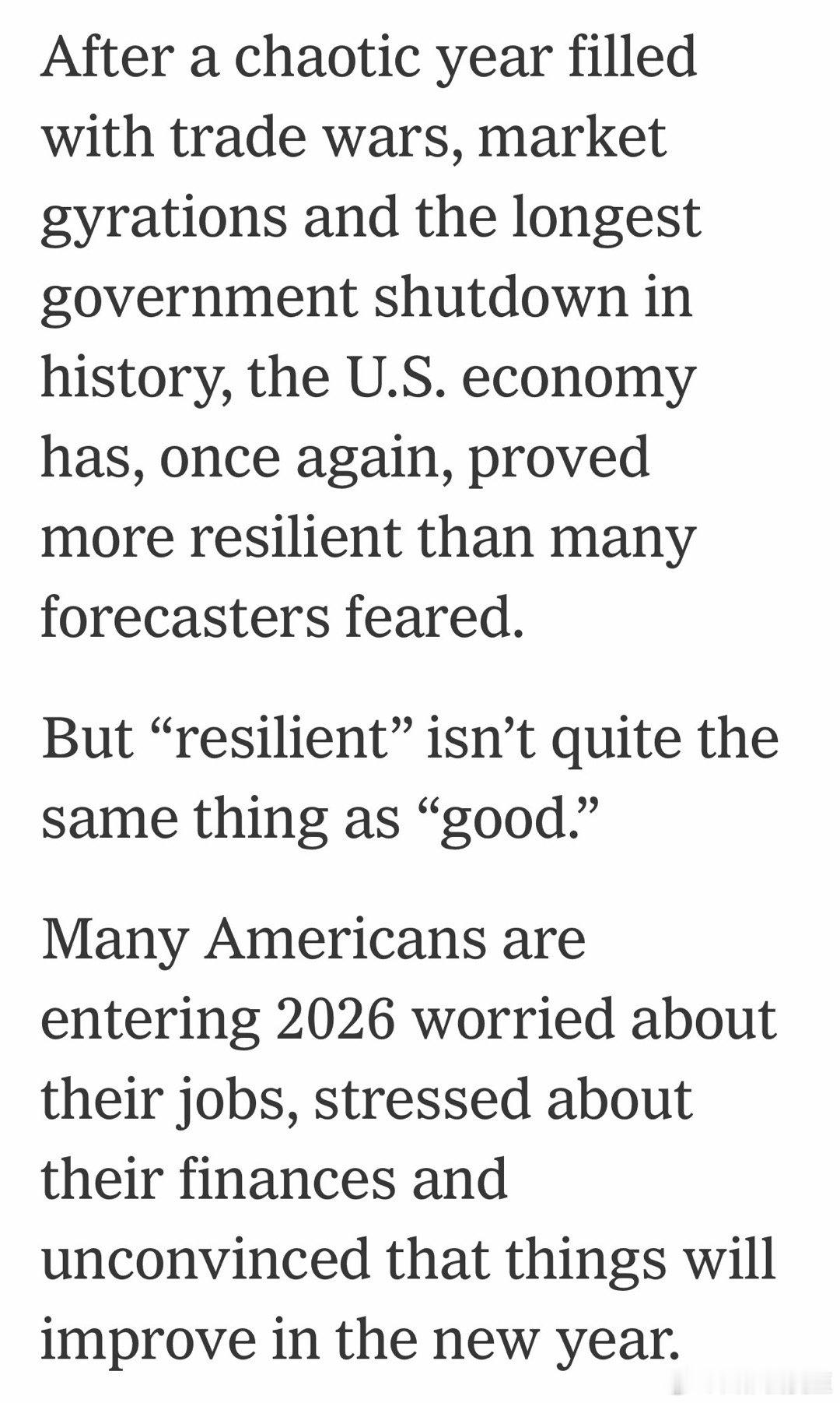 美国经济,2025年没有衰退,全面加关税/全球贸易战,和史上最长的政府关门,负面效果没有预测的大但“经济有韧性”不等于“经济状况良好”,多数美国普通人,2025更担心工作、更发愁物价、更买不起房子…而且,不认为2026会有改善总统的“黄金时代”已经/即将到来的宣传口号,无法对抗“医保涨价、电费涨价、幼儿园涨价…想要的东西买不起”的现实