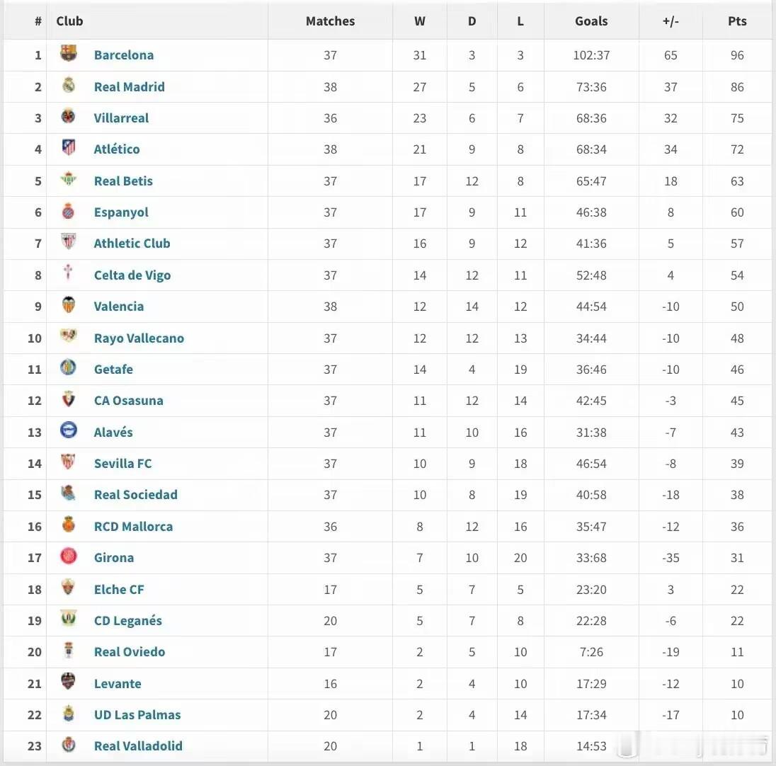 2025年度西甲积分榜:巴萨37战31胜高出皇马10分,马竞第四。2025年度的西甲比赛全部结束。在整个2025自然年,巴萨在联赛取得了31胜3平3负的战绩,拿到了96分,是整个西甲自然年成绩最好的球队,巴萨也顺利夺得了24-25赛季的西甲冠军。皇马在2025年比巴萨多踢了一场西甲,战绩为27胜5平6负,比巴萨少了10分。比利亚雷亚尔战绩第三,马竞第四,贝蒂斯第五。塞维利亚与皇家社会两支劲旅状态不佳,排在后半区。在打满全年比赛的17支非升班马和降级队中,赫罗纳战绩最差,只拿到31分。西甲