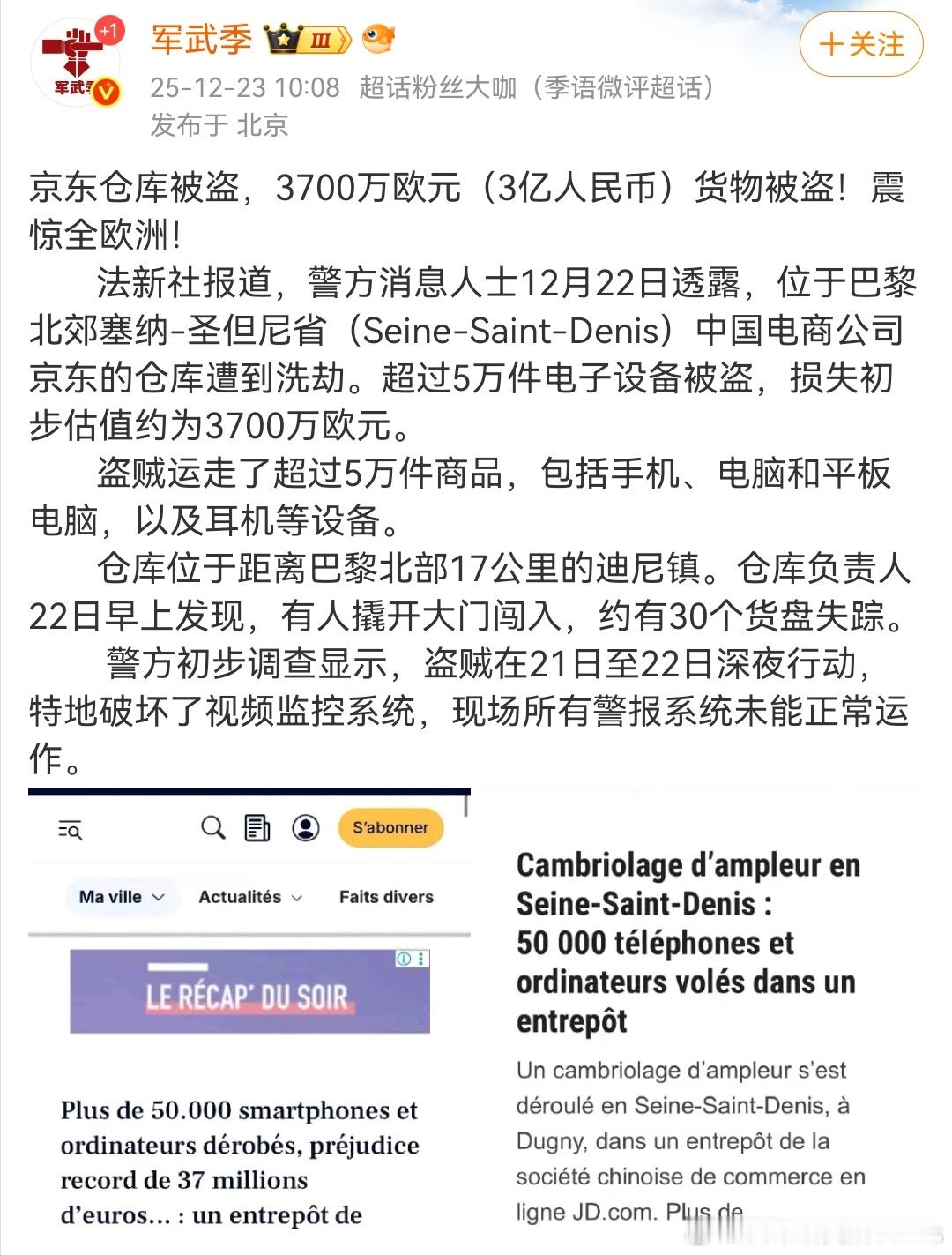 零元购都成直接搬仓库了?而且这玩意怎么可能是单纯的“盗窃”。3700万欧元的货啊,就是让他随便搬,都搬不了不少钱的,不找专业设备慢慢运根本搞不完这明摆着里应外合,烂到根上了。前有荷兰生抢安世控制权,现有法国搬空巴黎京东仓。就欧洲这营商环境,再继续吹就真的搞笑了。话说京东这波要是处理不好,给不出足够的威慑,以后生意怕是不好做,必须重拳。大v聊车