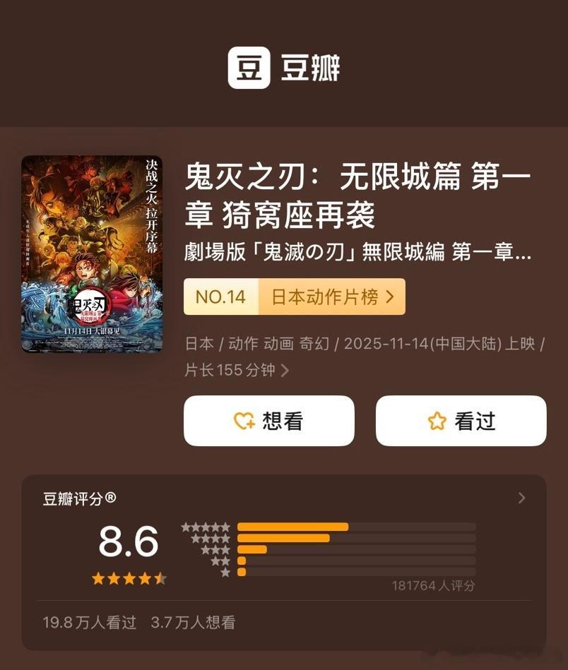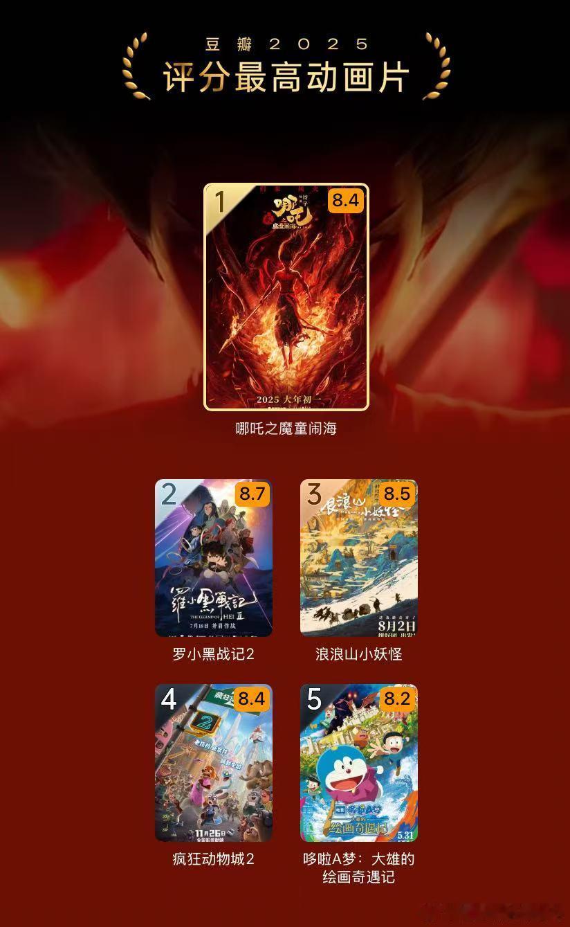 豆瓣真的很好笑。。评选的「年度评分最高动画片」前五分别是:《哪吒2》(8.4分)《罗小黑战记》(8.7分)《浪浪山小妖怪》(8.5分)《疯狂动物城2》(8.4分)《哆啦A梦:大雄的绘画奇遇记》(8.2分)不仅分数是乱序,也没有8.6分的《鬼灭之刃》如果真的这么受客观因素影响,那不如别叫「年度评分最高动画片榜单」呢?跨年电影愿