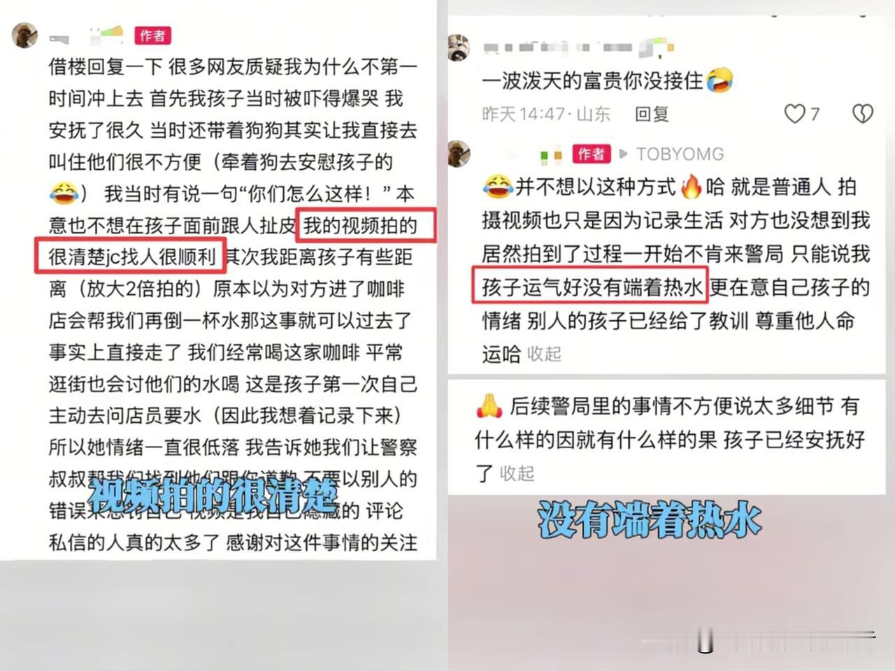 女孩端着咖啡店给的一杯水竟被当众打翻!妈妈的做法太解气,才是顶级家庭教育 女孩只是向咖啡店讨一杯水,却被另一个女孩狠狠打翻水杯,水花溅了满身。更让人气愤的是,肇事女孩全程毫无歉意,她的家长只轻飘飘喊了声孩子的名字,既不阻止也不道歉,扭头就带着孩子扬长而去。 被泼水女孩委屈得红了眼眶,她的妈妈没有忍气吞声,更没有拉着孩子自认倒霉,而是在安抚好女儿情绪后,果断选择了报警。 有人说这点小事没必要兴师动众,可在孩子的世界里,被无故欺负不是小事;在家庭教育里,让孩子忍气吞声才是大错特错。这位妈妈的做法,才是最硬核的教育:教孩子勇敢争取正当需求,更教会孩子,当自己的权益被侵犯时,永远有站出来维权的底气。 那些有养无教的孩子,家长不教,总有社会替你教。可到了那个时候,代价或许就不是一杯水那么简单了。 你觉得这位妈妈的做法是小题大做,还是理所应当?