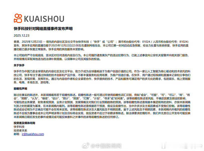 快手回应遭到网络攻击快手应用其他服务未受影响 快手应用的直播功能于2025年12月22日22:00左右遭到网络攻击,本公司已第一时间启动应急预案,经全力处置与系统修复,快手应用的直播功能已逐步恢复正常服务。快手应用的其他服务未受影响。关于这个问题明天我们刚好会采访两位信息安全专家 聊一聊怎么看待这件事🤔