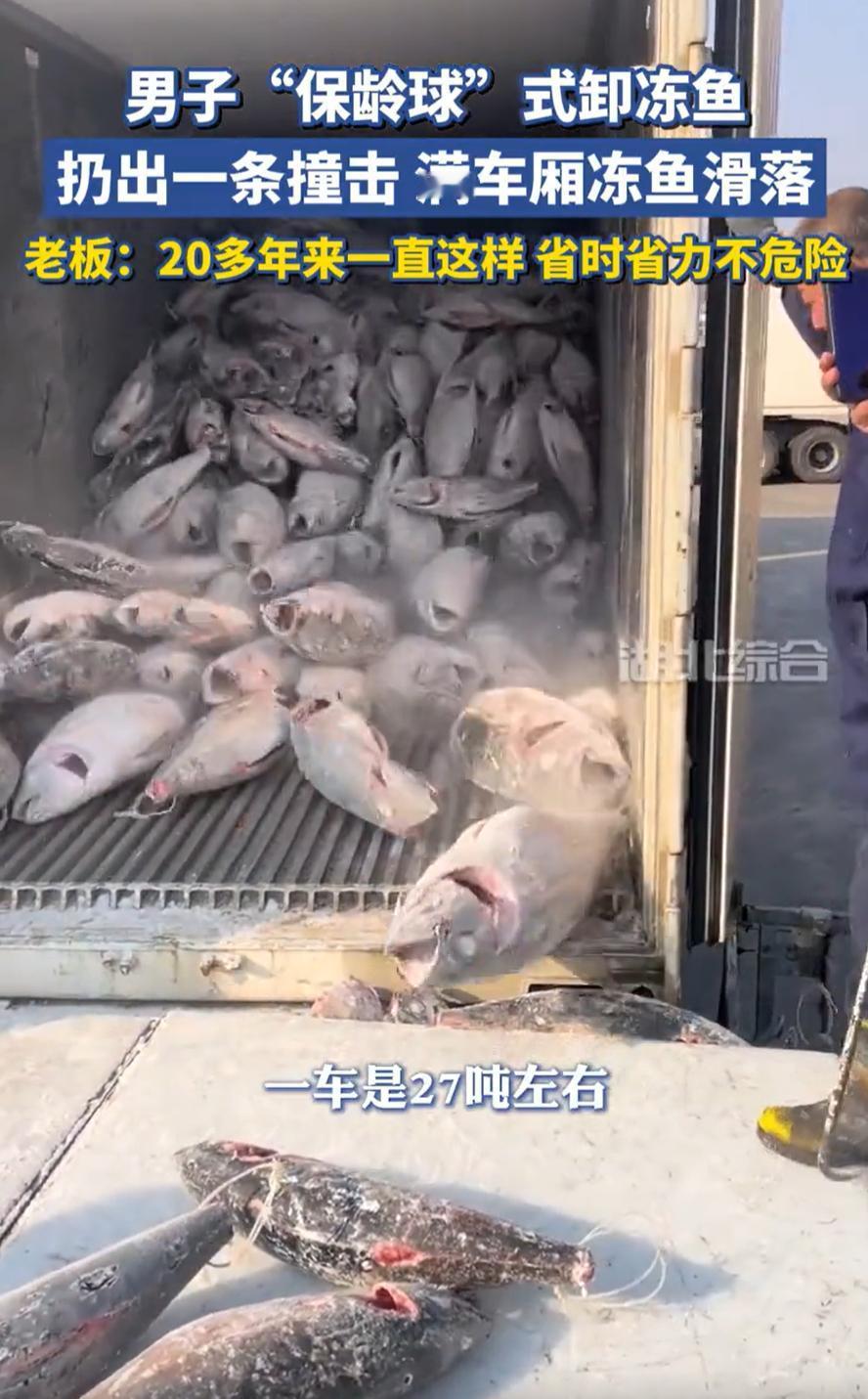 这就是劳动人民的智慧!山东烟台,一位卸鱼工人火了,车上装着27吨冻鱼,要是换个没经验的人来卸,一条条搬,不知道要干到什么时候。可这位师傅不一样,他站在车厢边,拿起一条冻鱼,像扔保龄球似的,朝鱼堆中间一掷,整整齐齐的冻鱼哗啦一下散开,顺着坡就滑下来了。一车鱼,他45分钟就能卸完,轻松利落 老板介绍,干这活儿的师傅,已经有二十年的经验了。他说这么干,一来安全,鱼扔出去自己就能躲开,不会被砸到;二来省劲儿,速度还快。这可不是投机取巧,而是实打实通过工作经验总结出最好的方法 不少网友看完就好奇:那当初是怎么装上去的呢? 其实方法也很简单,就是在下坡路上停车装车。鱼顺着坡往里堆,靠着重力自然压实,既稳当,又不会滑下来伤人。一装一卸,方法对应,都是顺着自然规律来,没那么多花哨,却特别管用 看了这个,我挺有感触的。咱们身边很多这样的劳动者,常年累月干一件事,早就摸透了里面的门道。这种经验,不是书本上能学来的,是实打实在现场一遍遍试出来、优化出来的 这种画面看着解压,说到底还是劳动现场长期磨出来的智慧。它不靠设备升级,也不靠口号,而是对现实条件的尊重。时间、体力、安全三件事同时兼顾,才算是真正的高效。很多人容易把效率理解成快,其实真正值钱的是省力和少出事