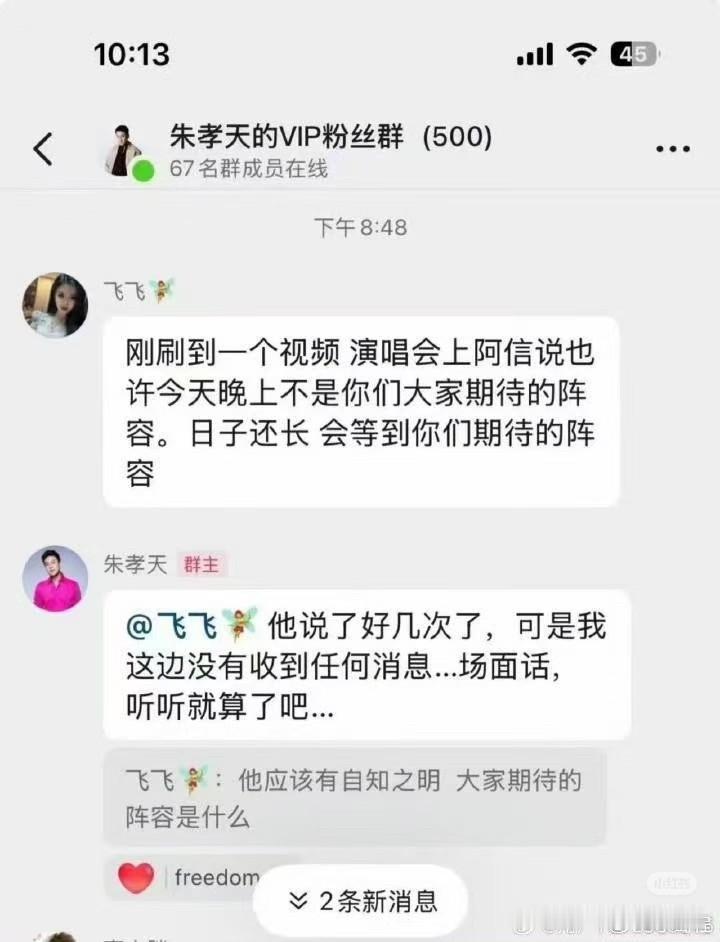 我猜到朱孝天情商低,也知道他说话直 但万万没想到他是把没礼貌当真性情 三番两次公开内涵阿信。 朱孝天缺席F4演唱会,阿信补全,他装出一副不在意的样子,却到处骂阿信。 网友发阿信的的图,他说“给你偶像截张好看的图那么难吗?”内涵阿信丑。 昨晚阿信两次感谢了朱孝天,并表示:“日子还长,会等到你们期待的阵容。” 朱孝天又跑粉丝群回应:“他说好几次了,可是我这边没有收到任何消息……场面话,听听就算了吧……”内涵阿信说一套做一套。 而他对阿信的粉丝直接骂“酸臭胡萝卜”,本来因为阿信属兔,他的粉丝自称胡萝卜,他却公开说人家又酸又臭。[捂脸] 只是4个人演出,他为什么就对准阿信一个人骂? 阿信