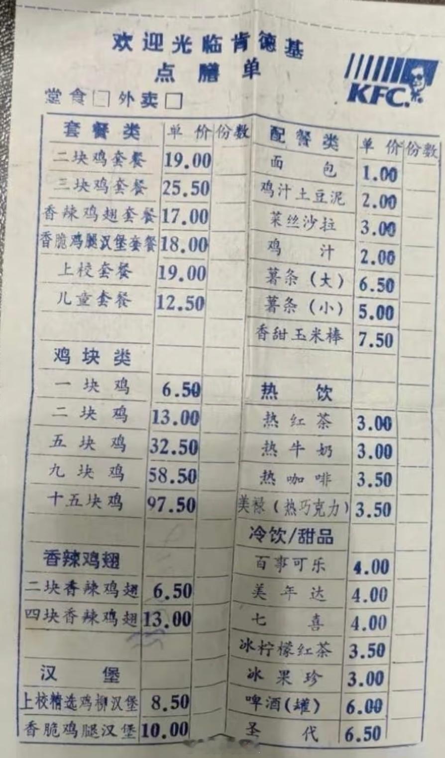 据说这是1995年的肯德基菜单,大家感受一下价格: