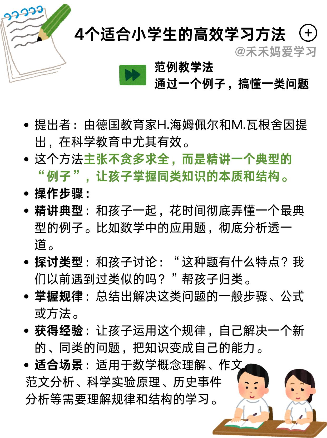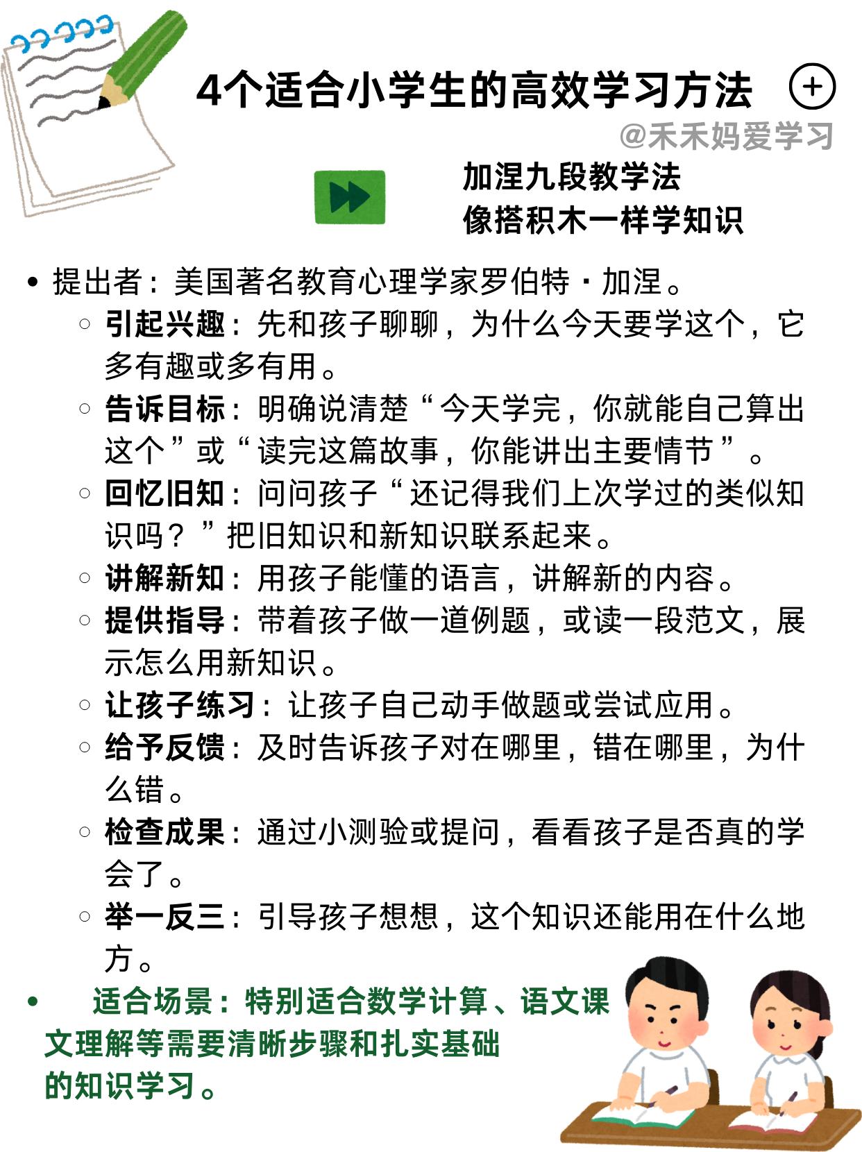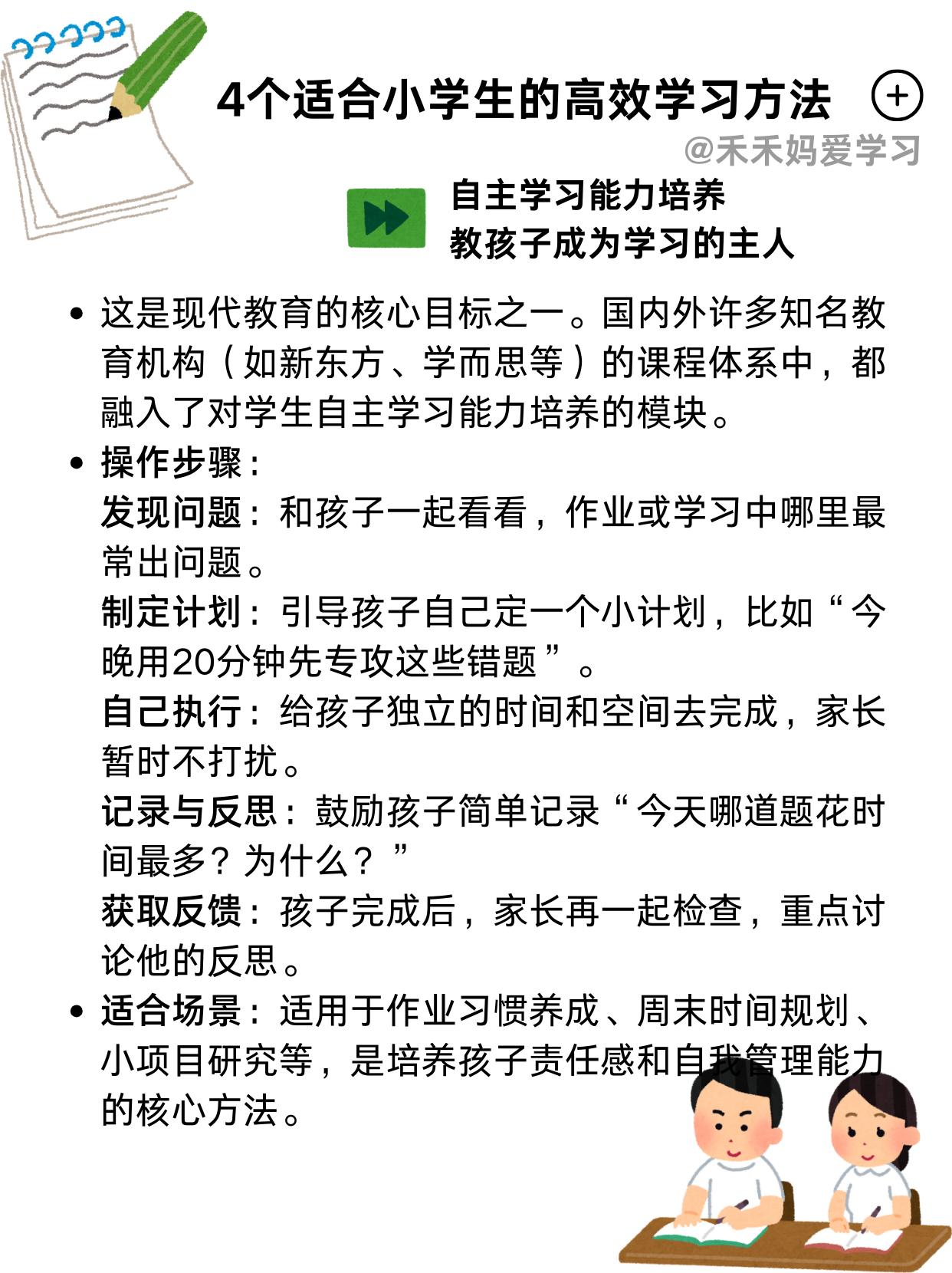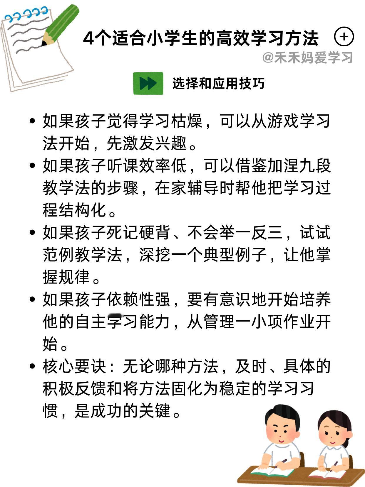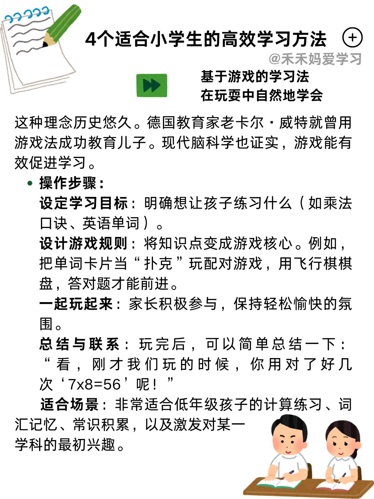 科学的学习方法可以提高学习效率,让学习达到事半功倍的效果,小学生所学的知识虽然不难,反复训练可以达到记住、学会的效果。 但这样持续下去,到了初高中随着学习量、学习难度的增加,孩子就很容易被落下,为了孩子未来的学习,我们做家长的必须从小学做起,给孩子传授一些适合他的学习方法。 4个适合小学生的高效学习方法分享给大家,各位小学生家长可以收藏起来认真看看,在辅导孩子学习的时候,结合孩子的特性,操作试试,或许就能帮孩子轻松学习,高效提分。 家庭教育