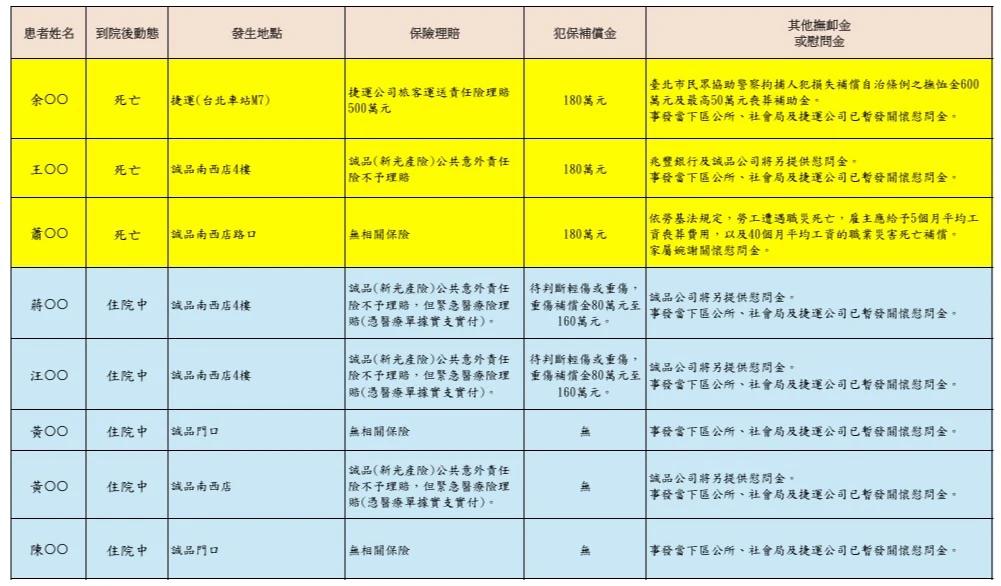 有温度!台湾北捷攻击案补偿方案公布:3名亡者家属可获180万元,英勇市民累计获1280万元抚恤金 2025年12月19日,台北捷运中山站及诚品南西店发生随机攻击事件,造成3名无辜市民不幸身亡,另有11人受伤,事件引起社会的广泛关注与谴责。为了帮助受害者及其家属,台北市法务局今日(23日)公布了详细的补偿方案。 根据法务局的公告,3位遇难者的家属均可向犯罪被害人保护协会申请每人180万元的补偿金。针对在事件中勇敢阻止嫌犯的余永昶,市府将根据《补偿自治条例》,提供600万元的抚恤金,以及最高50万元的丧葬补助金,台北捷运将提供保险理赔500万元,补偿金总计达到1280万元。 法务局长连堂凯表示,除了上述补偿外,市府还将在医疗照顾方面提供支持,针对其他受伤者及其家属,已实施「一案一社工」的方式,确保每位受害者都能获得适当的医疗照顾及心理支持。 此外,据悉,发生事件的地点台北大众捷运股份有限公司已启动《大众捷运系统旅客运送责任保险》的理赔程序,进一步保障受害者的权益。 在具体的补偿案例中,诚品南西4楼遇刺身亡的王先生,其家属虽然无法从新光产险的公共意外责任险中获得理赔,但仍可申请180万元的犯罪保险补偿。此外,兆丰银行及诚品公司也将提供慰问金,以表达对受害者家庭的关怀。 对于骑士萧先生的家属,由于他无相关保险,根据《劳基法》规定,雇主需支付5个月平均工资的丧葬费用及40个月平均工资的职业灾害死亡补偿。社会局也强调,他们将通过市府「公益台北爱心平台」启动「1219事件扶助项目」,让民间捐款能够迅速转化为对受害者家庭的实质支持。 同时在攻击事件中表现英勇的余先生,也将进入忠烈祠,以褒奖其见义勇为的精神。 城市有温度,人民才幸福。