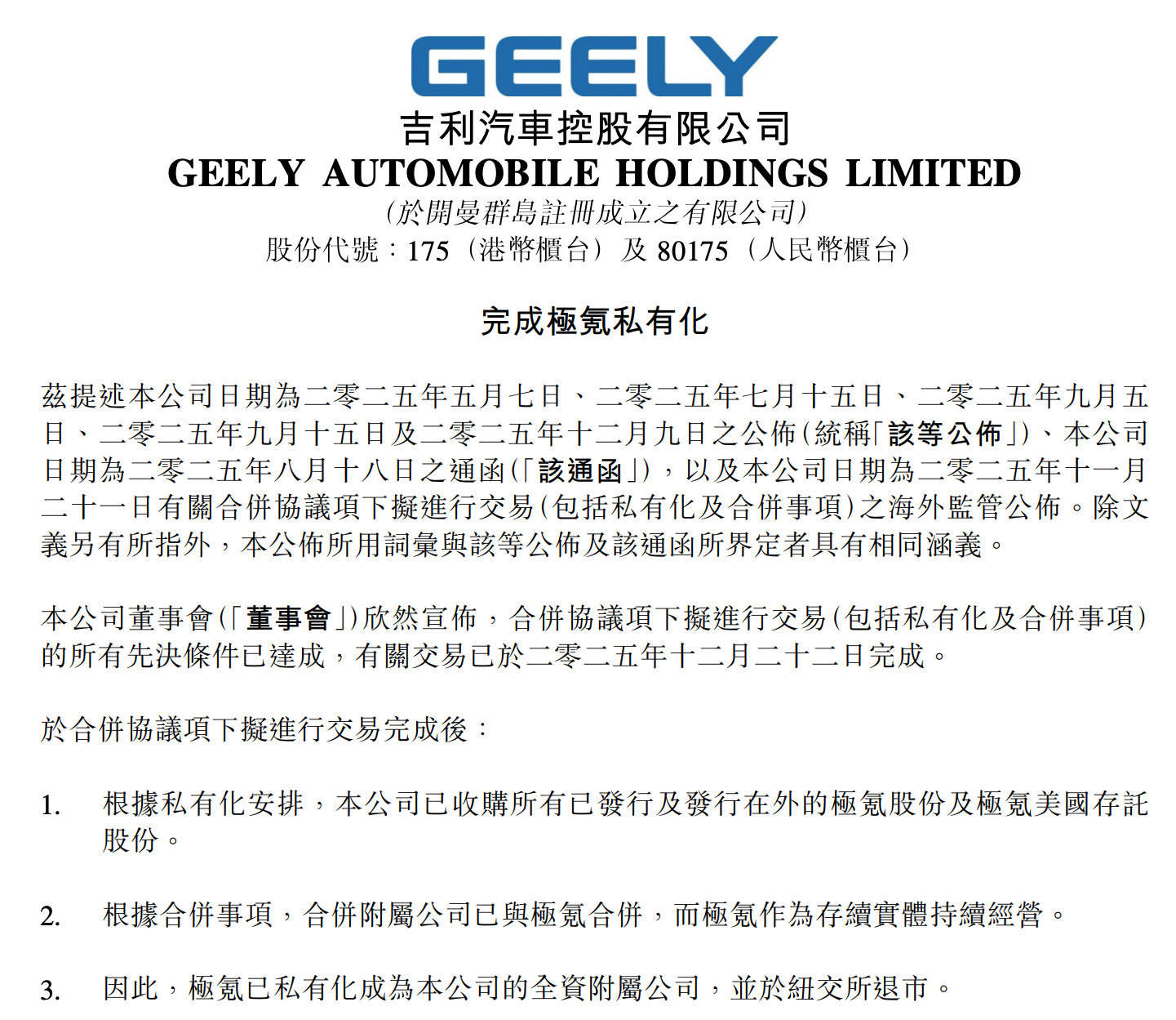 吉利汽车宣布,极氪与吉利汽车完成合并,极氪已成为吉利汽车的全资附属公司,并于纽交所退市。