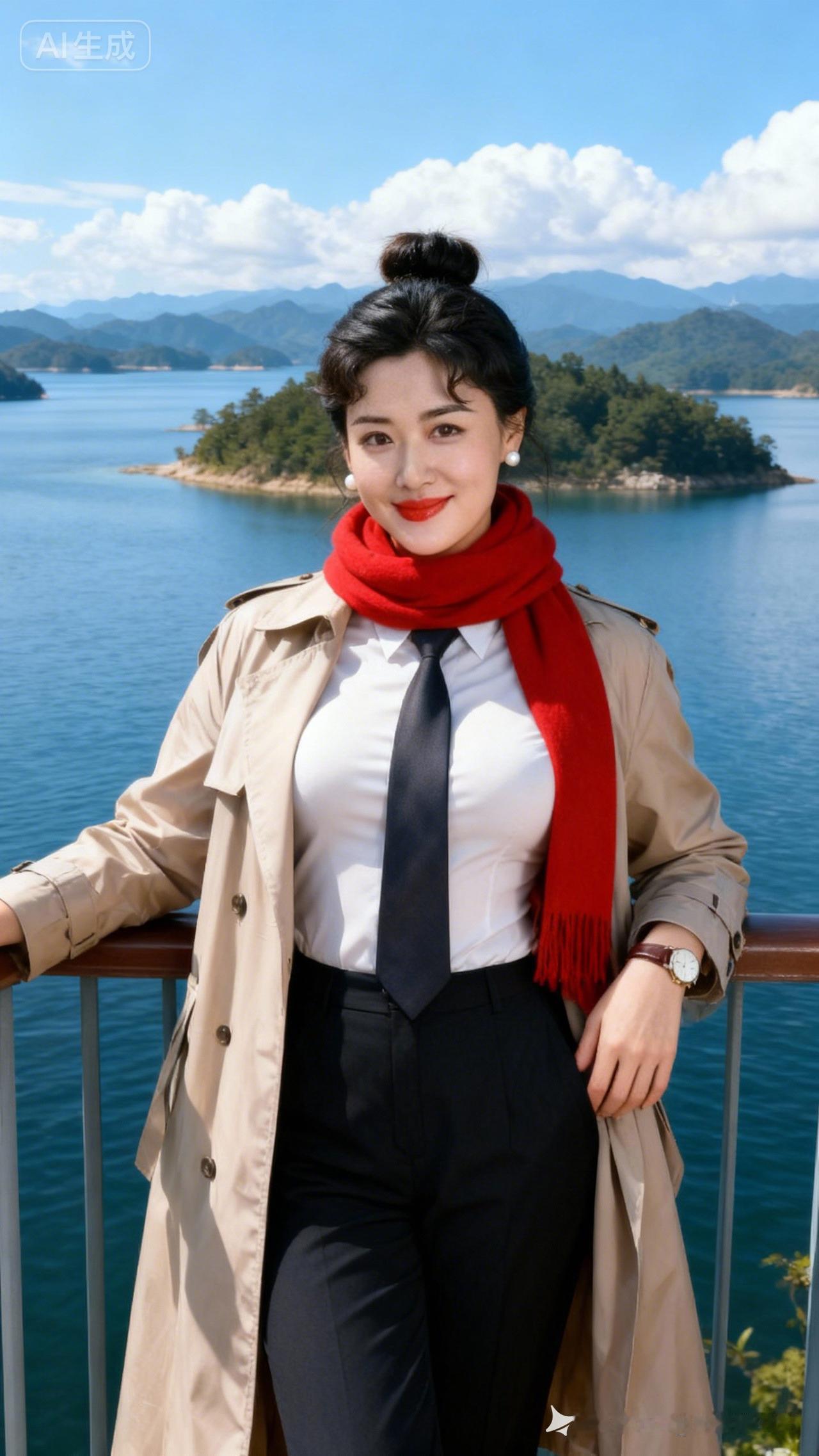 优雅职场风,红围巾点缀,湖边美景相伴!
