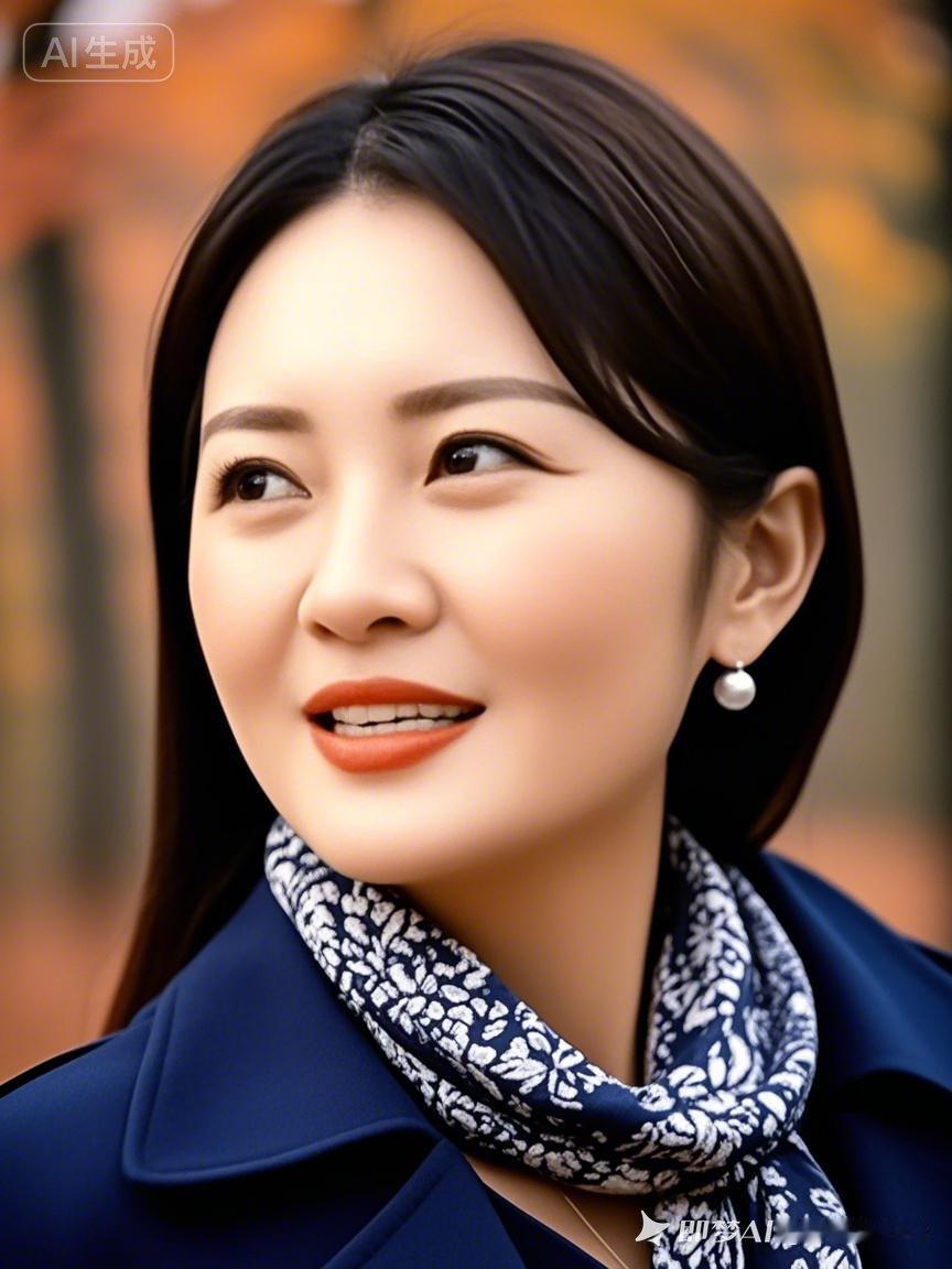 秋日暖阳下的优雅微笑,珍珠耳环与蓝白围巾相得益彰。