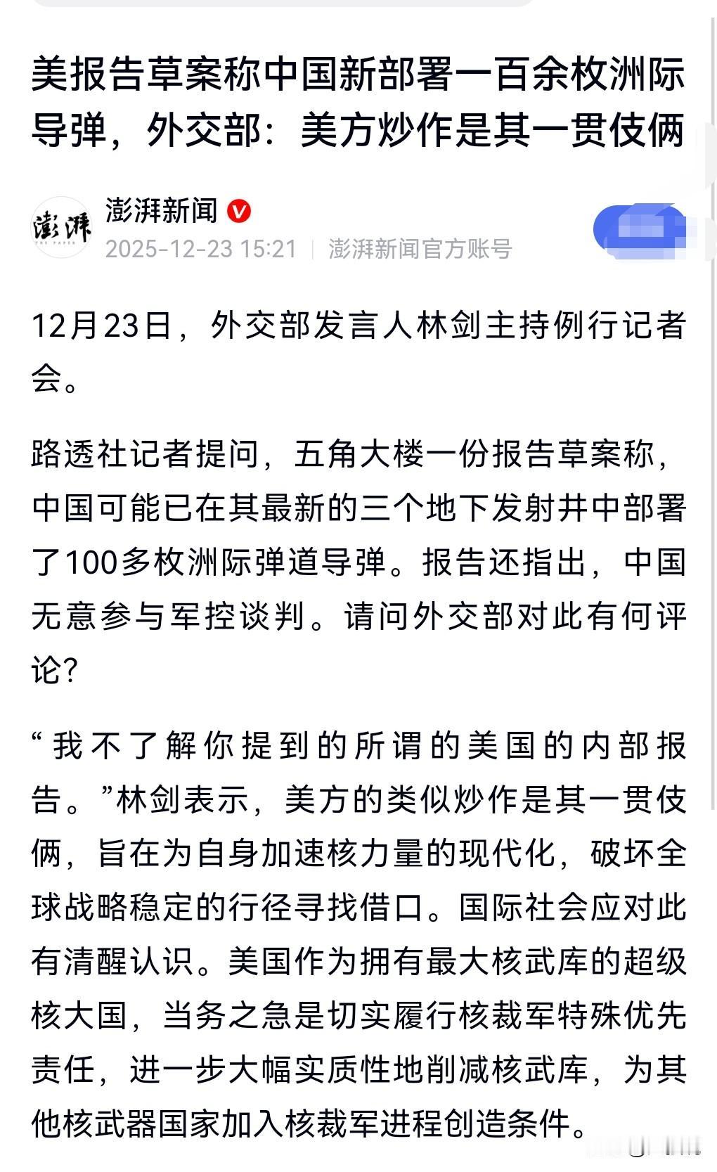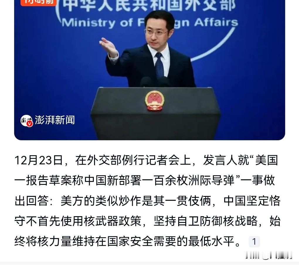 美国真的是太会搞事情了,一天到晚的针对中国,就没有点正事干吗? 就不能好好的做个人吗? 近日美国称中国部署了百余枚洲际导弹。 中方回应美称中部署百余枚洲际导弹,美国的类似炒作是其一贯伎俩,中国坚定恪守不首先使用核武器政策,坚持自卫防御核战略,始终将核力量维持在国家安全需要的最低水平。 中国真的是太有责任感了,是一个负责任的大国,非常的爱好和平,世界第一爱好和平的国家。