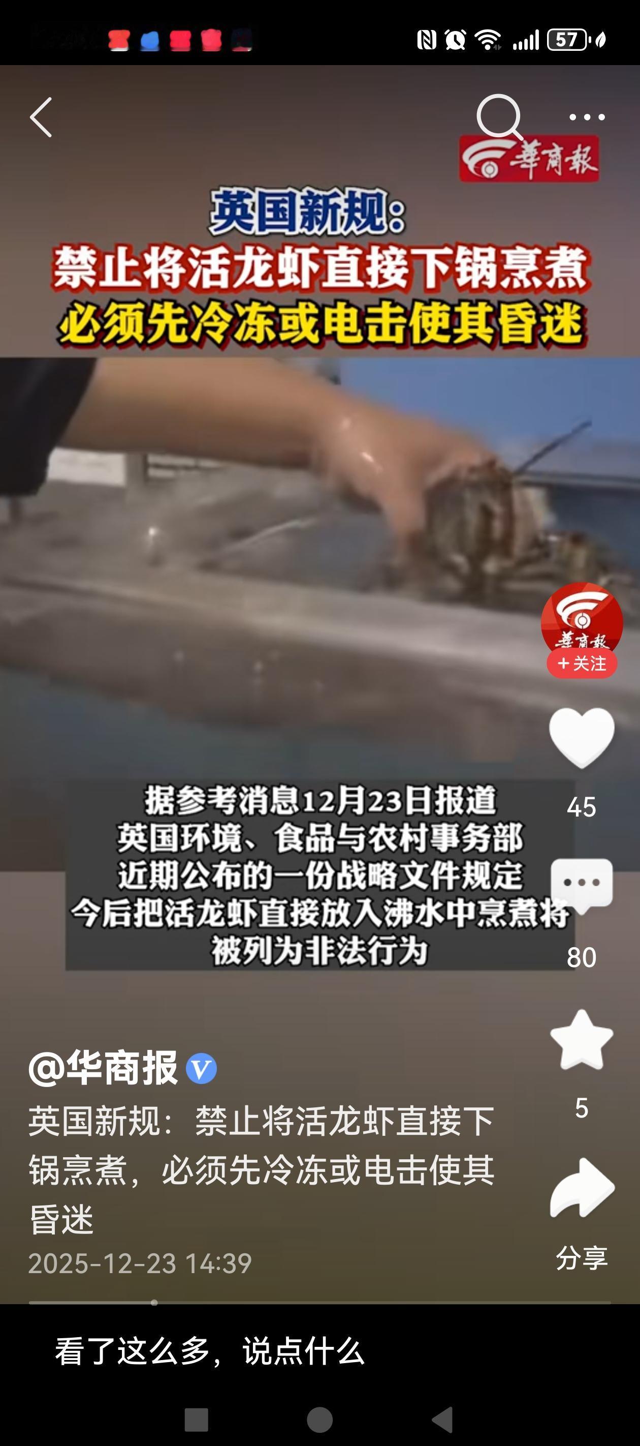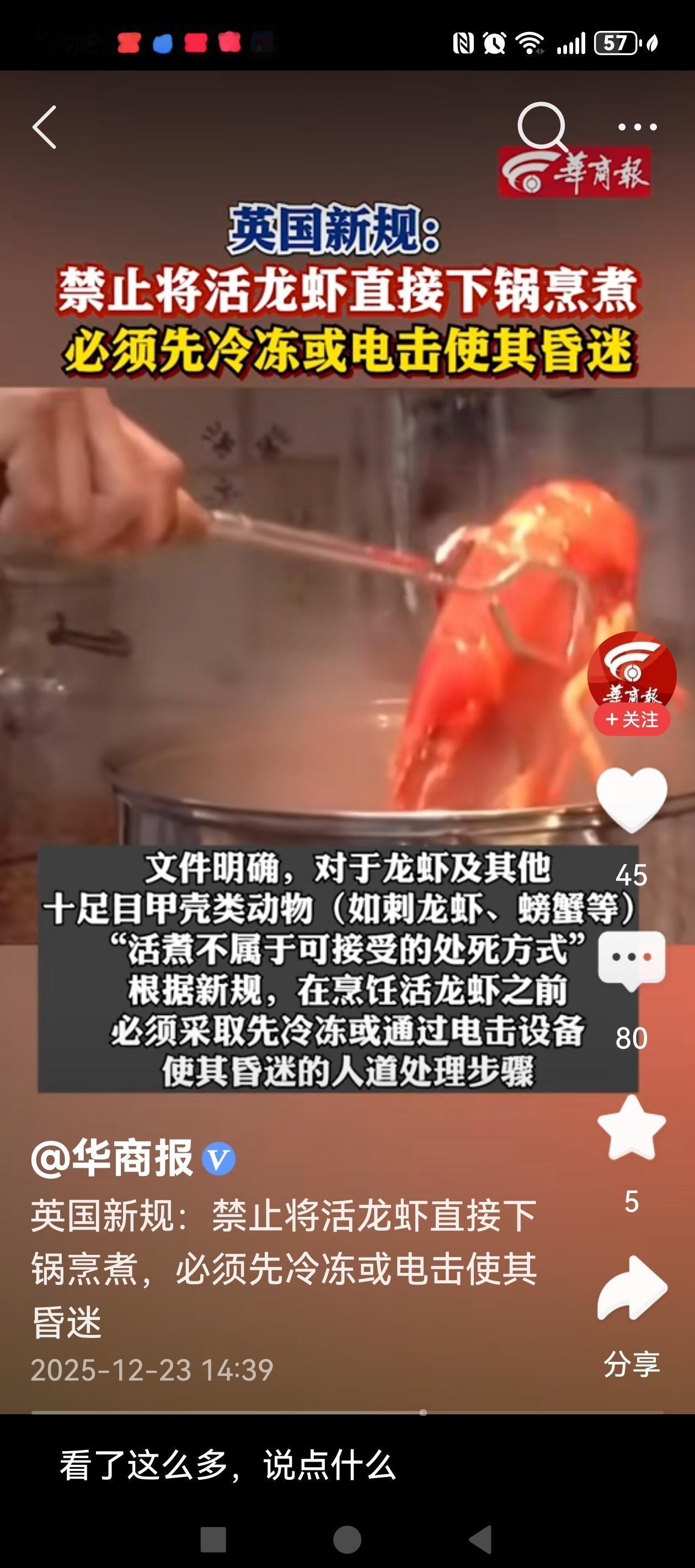 不少国家都有看似奇葩的法律规定,这些都是与当地的本土文化、生活习俗、宗教信仰、价值观念和国情分不开的,所以没有什么好奇怪的。就像英国的这一规定只适合英国一样,对其他国家没有约束力。 在我看来,英国的这种规定还是有些残忍,毕竟电击、冰冻也是杀生。如果按照英国有关部门的逻辑,应该把这些甲壳类海鲜养到自然死再食用,这才应该是他们能够接受的方式。 与其费劲巴力的采用电击和冰冻,不如我们给英国有关部门出个主意,用高度白酒让龙虾、螃蟹们来个酩酊大醉,再去蒸煮、烹饪它们就没有痛苦了,也免得想吃它们的人假惺惺的仁慈!