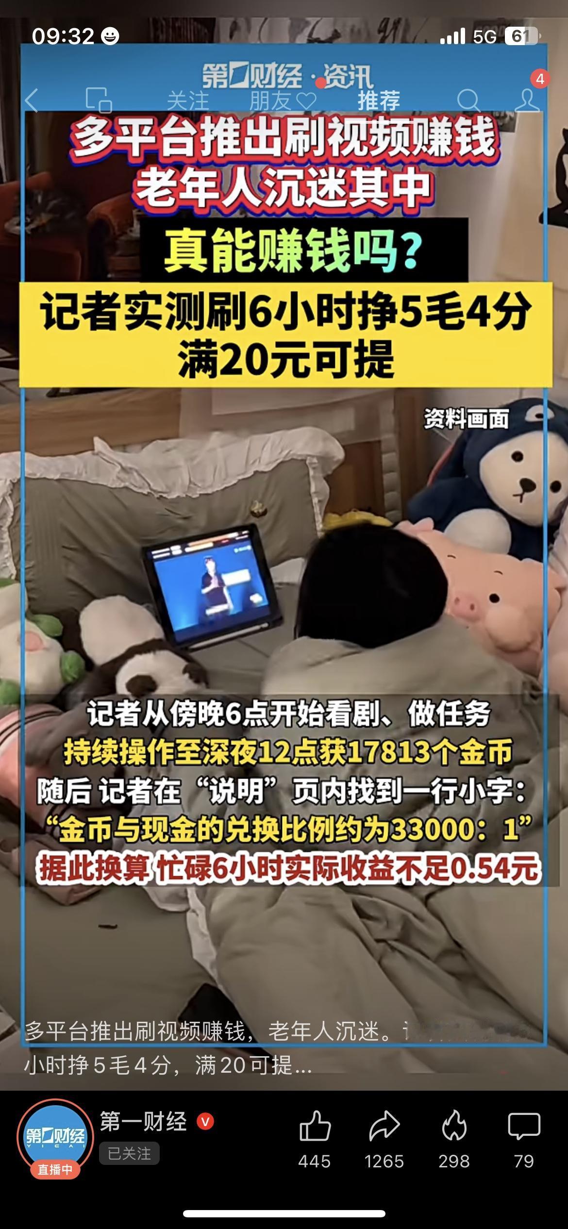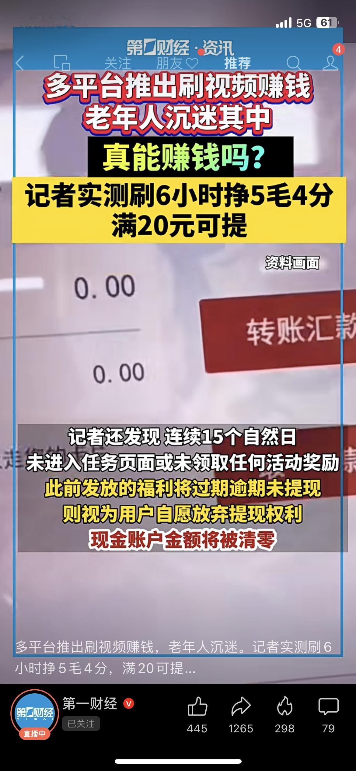 刷6小时视频只赚5毛4!老年赚钱APP竟是陷阱 张大爷刷6小时视频只赚5毛4分,气得差点摔手机 记者实测:提现要攒20元+连续签到7天,15天不操作还会清零收益 老人沉迷既亏钱又伤身体,家人得多提醒 刷视频赚钱陷阱 老年人防骗 APP套路揭秘 你身边有老人沉迷这类APP吗?