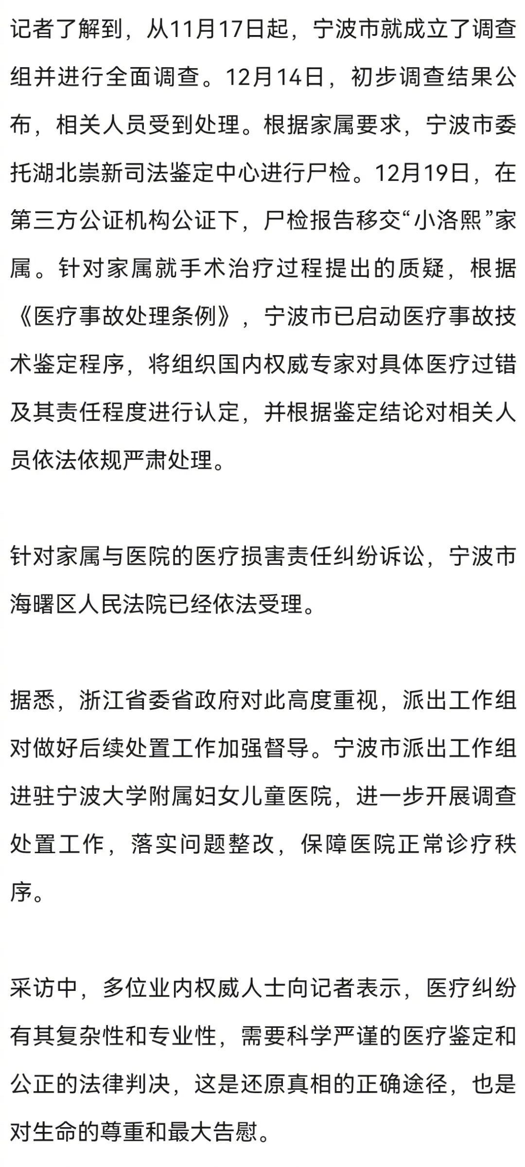 小洛熙术后离世最新进展小洛熙医疗事故鉴定已启动热点解读 “小洛熙医疗事故”之所以引发巨大社会关注,关键在于信息反复、表述矛盾对公众信任的强烈冲击,动摇了对专业医疗体系与监管公正性的信心。尸检结论与术前诊断不一致、医院声明发布又删除,使公众产生“是否存在隐瞒或推责”的疑虑,舆情迅速放大,医患对立情绪被进一步激化。对家属而言,这是难以承受的二次伤害。目前,事件已超出个案范畴,在舆论场演变为对医疗安全、信息透明和问责机制的全民审视。若处理失当,不仅损害医院声誉,更会削弱公众对高风险医疗决策的信任,诱发“恐医”“避医”情绪。目前希望上级调查组以独立、权威的医疗事故鉴定为唯一责任认定依据,确保程序公开、证据完整、结论可核查,同时给予家属充分知情权与救济渠道。专家认为,从长远看,机制更需系统完善:一是建立重大医疗不良事件的信息发布规范,防止随意表态、反复更改;二是强化术前多学科会诊与高风险手术的外部质控;三是推动第三方鉴定机构真正独立运行;四是完善患方参与机制与医疗纠纷早期调解制度。唯有让专业归专业、让程序更透明,才能在悲剧之后重建信任,防止伤痛重演。