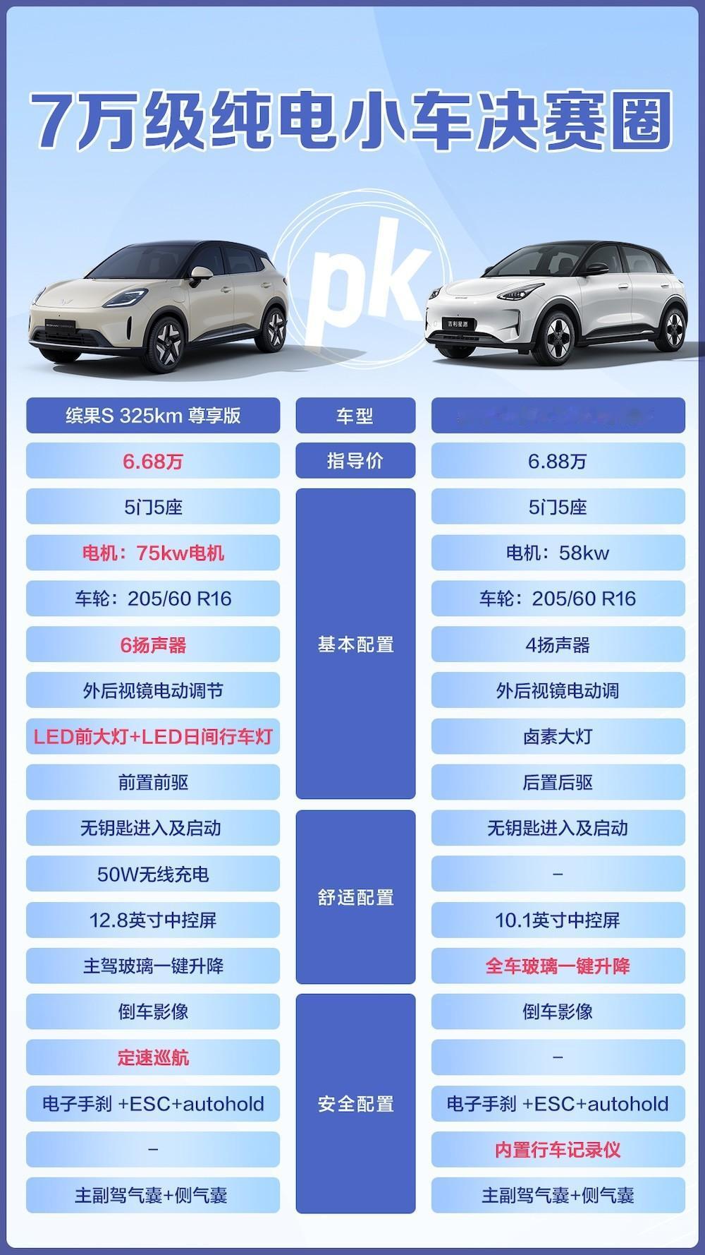 7万级纯电小车:星愿PK缤果S,二选一就够了。 纯电小车选车越来越丰富,总觉得哪台都有可取之处,可要问比一圈下来哪两台能进入决赛圈,我想只有五菱的缤果S与吉利银河的星愿有资格。 咱就说7万以内的两个版型,缤果S这边325km入门续航、星愿也给到了310km,充一次电跑一周没问题,而且两车都标配快充,应该说有没有家充桩都没啥焦虑。 而面对一些快速路或者是爬坡场景,星愿的58kW虽然稍吃力些但也够用,而缤果S更标配75kW电机,满员出游也不为性能发愁。要是遇到回家晚了,缤果S倒是有LED日行灯+远近光,比起星愿的卤素大灯还是要更安全些。 要是喜欢日常在车上堆放些东西的朋友,缤果S达到达到4265mm的车身比星愿长了足足130mm,这不光让它二排腿部更有优势,1450L的后备厢也多了130L。就算不翻折后座,缤果S也能通过下沉式后备厢实现分层分区储物,拿取使用也比星愿更方便。 至于说智能,两台车都支持语音交互与包括HiCar/Carlink在内的手机互联,不过,比起10.1英寸屏的星愿,标配8.88+12.8英寸双液晶屏的缤果S还带有灵语AI+DeepSeek大模型,连续对话交互会更流畅且实用。 当然,在配置上星愿确实有全车玻璃一键升降等优势,但标配50W无线充电、定速巡航、6扬声器的缤果S似乎依旧是更全面的那个选择,也是我们今天二选一的“优胜者”。