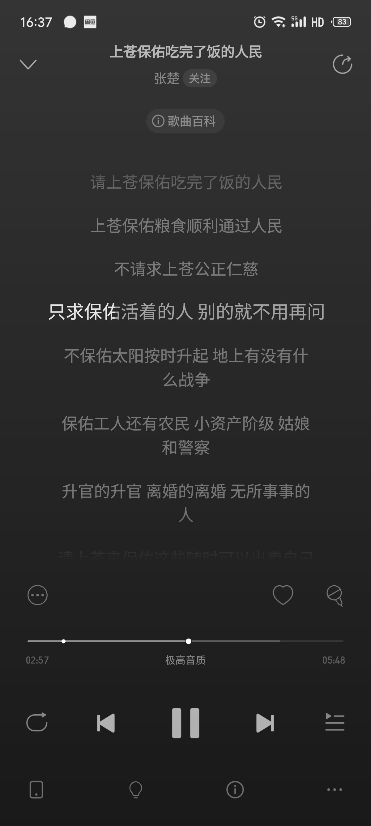 没想到张楚在90年代初唱响的歌,竟然击中了三十年后的中美《上苍保佑吃完了饭的人民》不请求上苍公正仁慈,只求保佑活着的人 别的就不用再问,不保佑太阳按时升起 地上有没有什么战争,保佑工人还有农民 小资产阶级 姑娘和警察,升官的升官 离婚的离婚 无所事事的人~吃饱饭就是硬道理牢A