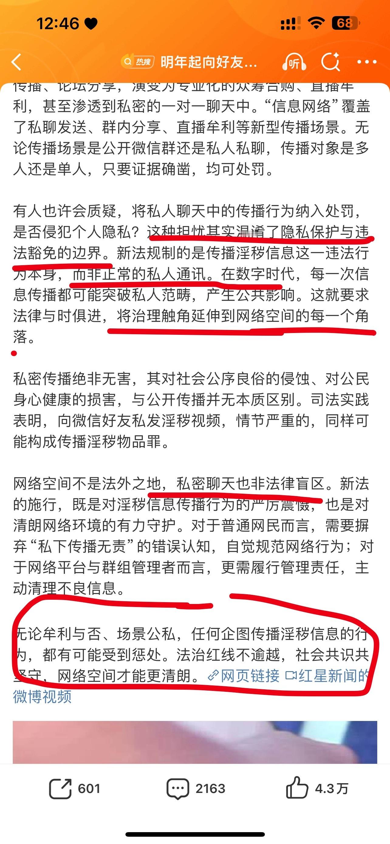 好奇怎么区分普通聊天内容和淫秽信息,不监控怎么识别,这不矛盾吗,私人聊天记录还在隐私保护里面吗?数年前有个案例,夫妻在家看片的(图三),那以后这样是不是也是违法?发淫秽信息将违法并不侵犯个人隐私明年起向好友发淫秽信息违法群主放任成员传播色情也将获刑