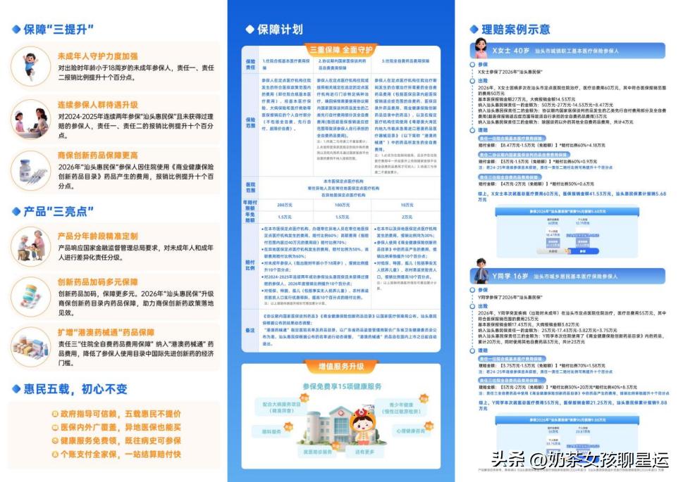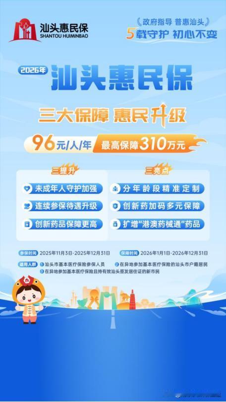 现实中,越是那些拥有财富和卓越能力的人,往往越具备超前的风险意识。他们深知,人生最大的投资不是豪车名表,而是给自己和家人买一份确定的“安心”。真正的远见,是未雨绸缪,在风雨未至时筑好堤坝。对于我们普通人来说,这份保障同样不可或缺,它是对父母养育之恩的守护,也是陪伴孩子成长的坚实后盾。 “汕头惠民保”就是专门为汕头市民量身定制的这份安心之选。它由政 府指导,多家大牌保 险公司共同承办,已经累计赔付超1.2亿元,实实在在帮了253万人次的大忙。2026年的版本不仅保费维持96元不变,最高保障更高达310万元,每天不到3毛钱,就能换来一整年的踏实。特别值得一提的是,今年的保障力度全面升级:未成年人报销比例提升,对孩子更友好;连续参保且无理赔的人群待遇也升级,这份诚意很足。而且支持医保个账支付,不用额外掏现金,还能用上“港澳药械通”等创新好药,真正做到了花小钱办大事。 岁月静好是因为有人替你负重前行,而“汕头惠民保”就是那个在关键时刻为你撑伞的人。不要让忙碌成为借口,为了父母、为了孩子,更为了那个努力生活的自己,请务必抓紧时间。最后再次提醒大家,参保截止日期是12月31日,千万别错过这个给自己加一道“安全锁”的机会,早参保,早安心!