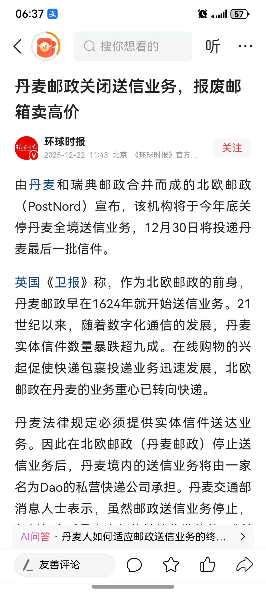 丹麦邮政关闭送信服务。全球数字化的浪潮势必淹没一些古老的行当,虽然没统计过,但国内邮政的普通信件95%以上肯定是商函或账单。 世界邮政联盟逐渐变为世界包裹快递联盟,邮政的信件和汇兑业务会在什么时候彻底的退出历史舞台,不得而知,至少在中国,还有极少数乡村,可以看到送家书、送汇款单的邮递员的身影。
