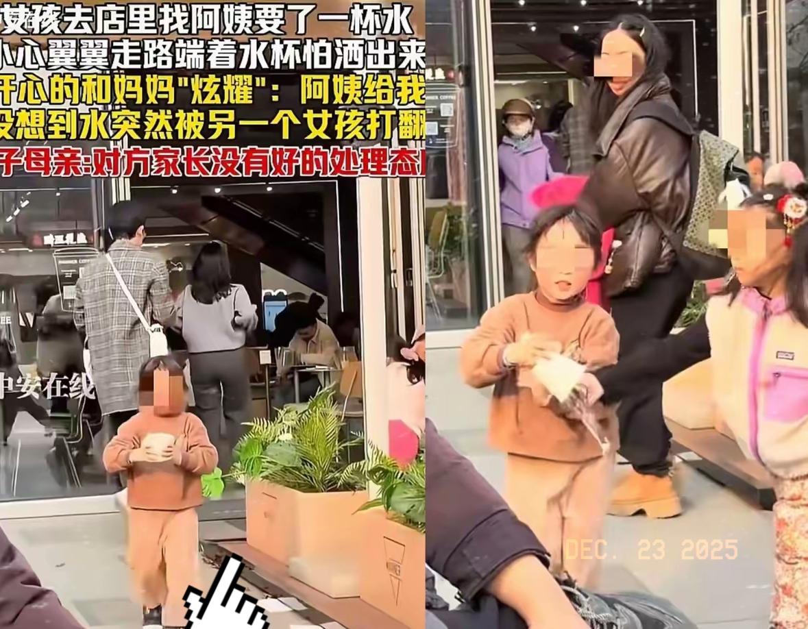 女孩讨免费水,结果被别的女孩打翻 女孩妈妈报警并不是小题大做 那个打翻水杯的女孩,没有丝毫歉意,她的家长也只是喊了声孩子的名字,也不阻止,也没向那女孩和家长道歉,反而直接带着孩子离开了。 别觉得报警是小题大做,这恰恰是最清醒的教育!孩子讨水喝本就没做错,凭啥要忍下被欺负的委屈?更气人的是对方家长的漠视,一句制止没有,一声道歉全无,这哪里是养孩子,分明是放任孩子养成“没规矩”的性子。 这位妈妈的做法太赞了,她没有拉着孩子忍气吞声,也没有当场撒泼吵架,而是用报警这种正当途径,告诉女儿:你的权益值得被保护,善良不该被践踏。 那些觉得“孩子间打闹没必要较真”的人,才是真的糊涂,小错不纠,将来只会酿成大错。如果是你遇到这种事,你会选择报警,还是私下和解?