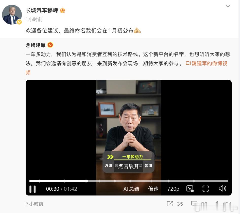 长城最近动作频频,本以为前几天跟央视主持人+崔秘书长的一期对话,跟昨天的魏牌蓝山VLA版发布会后,就会进入相对常态的产品销售期。今天晚上23 点,跟一起搞的纪录片《魏建军:长城内外》上线,对上一次《长城还能活的过明年》那条片子,很多内容与观点我都还记忆尤新。这次是跟央视财经联合搞的,感觉跟近期魏总频频输出的行业发展、价格战、车圈恒大论等应该会有些关联,到时候我也会看看。毕竟现在汽车行业超越房地产行业,成为影响国民生态第一大行业,看看从完全的财经视角去倒推回些汽车行业,我觉得是挺好的。还是那句,兼听则明嘛。而且,我也看到的一条微博,关于长城「一车多动力多姿态」的平台命名,之前我给提的是「星罗平台」,也有朋友提的是「万象平台」。这个悬念 1 月初就会揭秘了,到时候也一起看看! 建议你,持续关注我!新能源汽车长城汽车