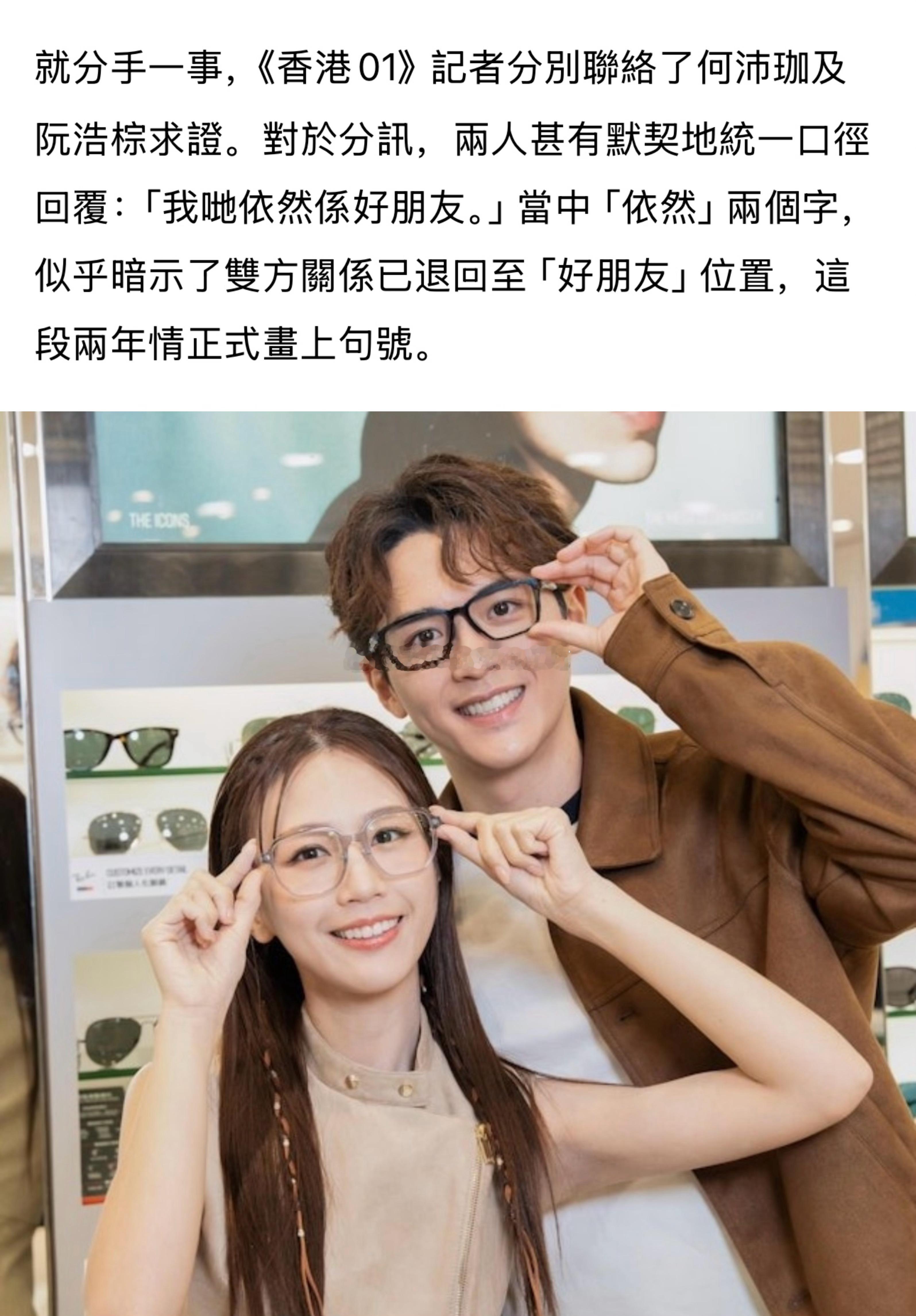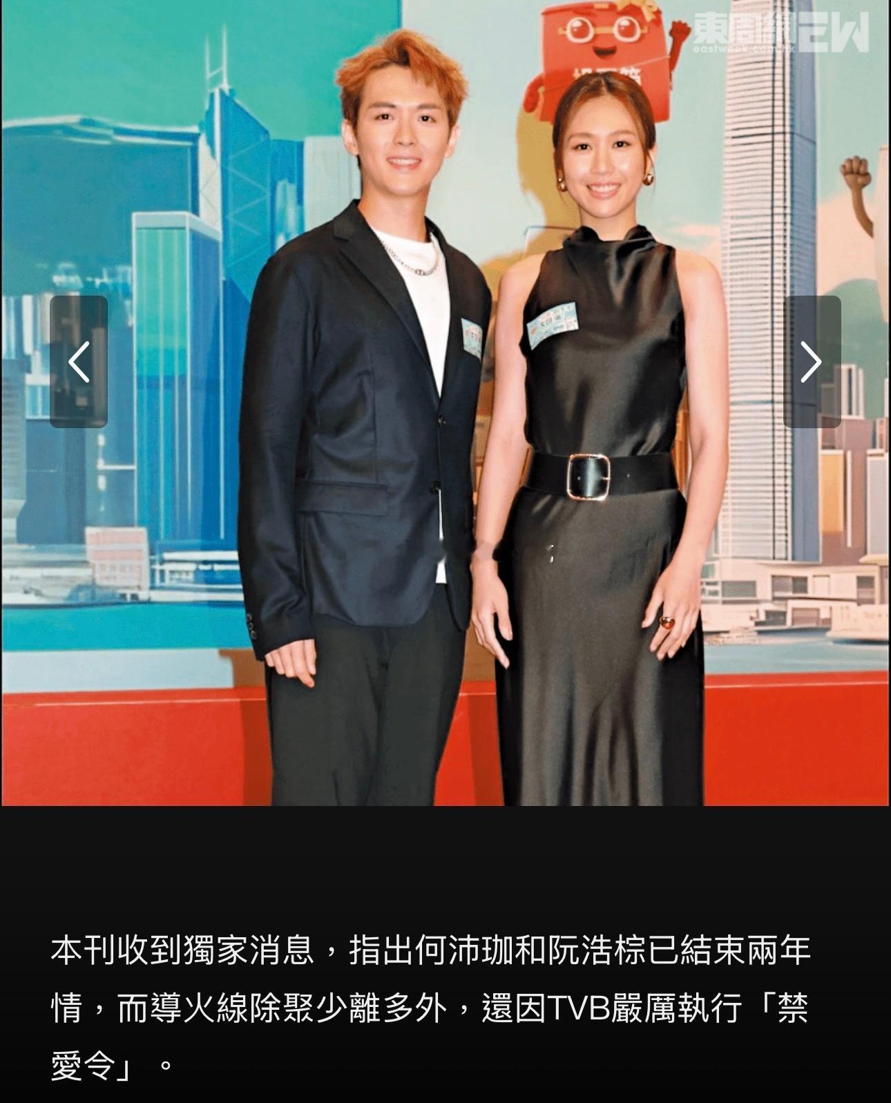 报道|阮浩棕何沛珈分手.现年29岁的何沛珈,2020年参选港姐入行。加入TVB后主持《东张西望》。过去几年,她获得公司力捧,不仅担任节目主持,还有份参演剧集,火速上位。2023年,她与阮浩棕因拍摄剧集《异空感应》而秘密交往。虽然双方一直未有亲口承认情侣关系,但被追问绯闻时,他们亦坦承正在「了解中」。密友透露,两人已正式结束两年的地下情:「何沛珈和阮浩棕都在TVB的力捧名单之中,之前他们半公开恋情,那时公司已经坚决say no,为维系这段爱情都饱受压力。现在他们决定乖乖听公司话,全力为事业打拼;加上他们近期工作都好忙,阮浩棕四周飞拍旅游综艺节目,两人聚少离多,几乎一个月才见一次,种种原因,最终分手。」就分手一事,记者分别联络何沛珈及阮浩棕求证,两人回复:「我们依然是好朋友。」力捧中的花旦与小生包括:陈晓华和朱敏瀚、陈懿德和罗天宇、陈滢和周嘉洛等,统统乖乖接「令」。