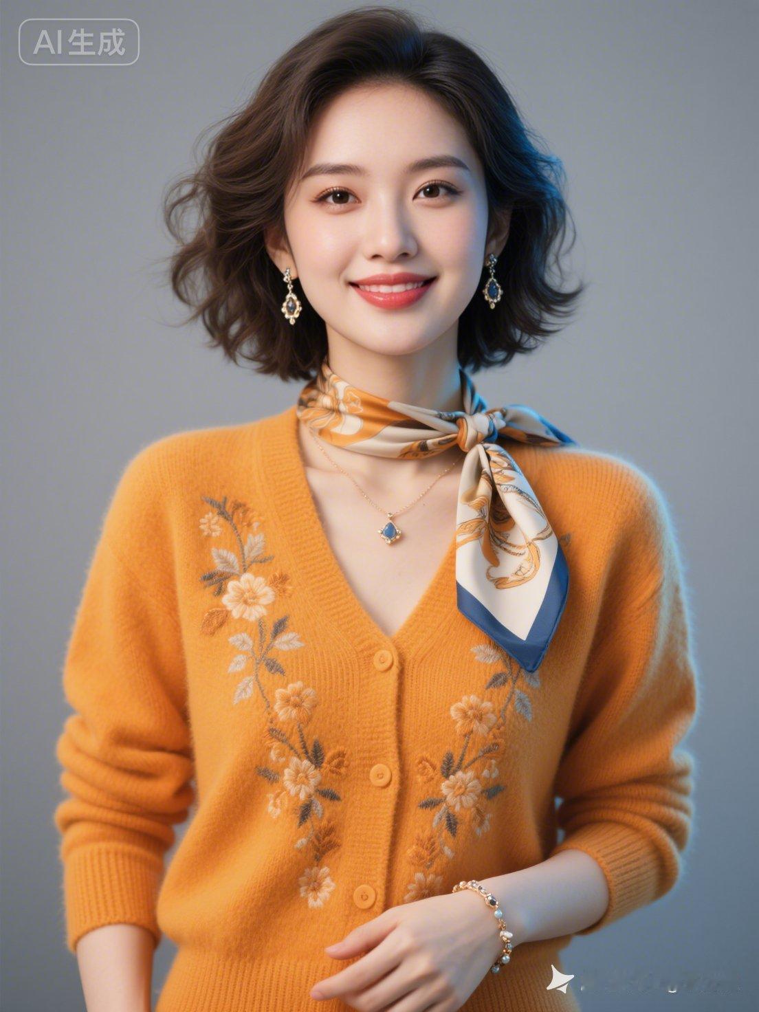 甜美少女风,暖橙毛衣搭配印花丝巾,温柔动人!