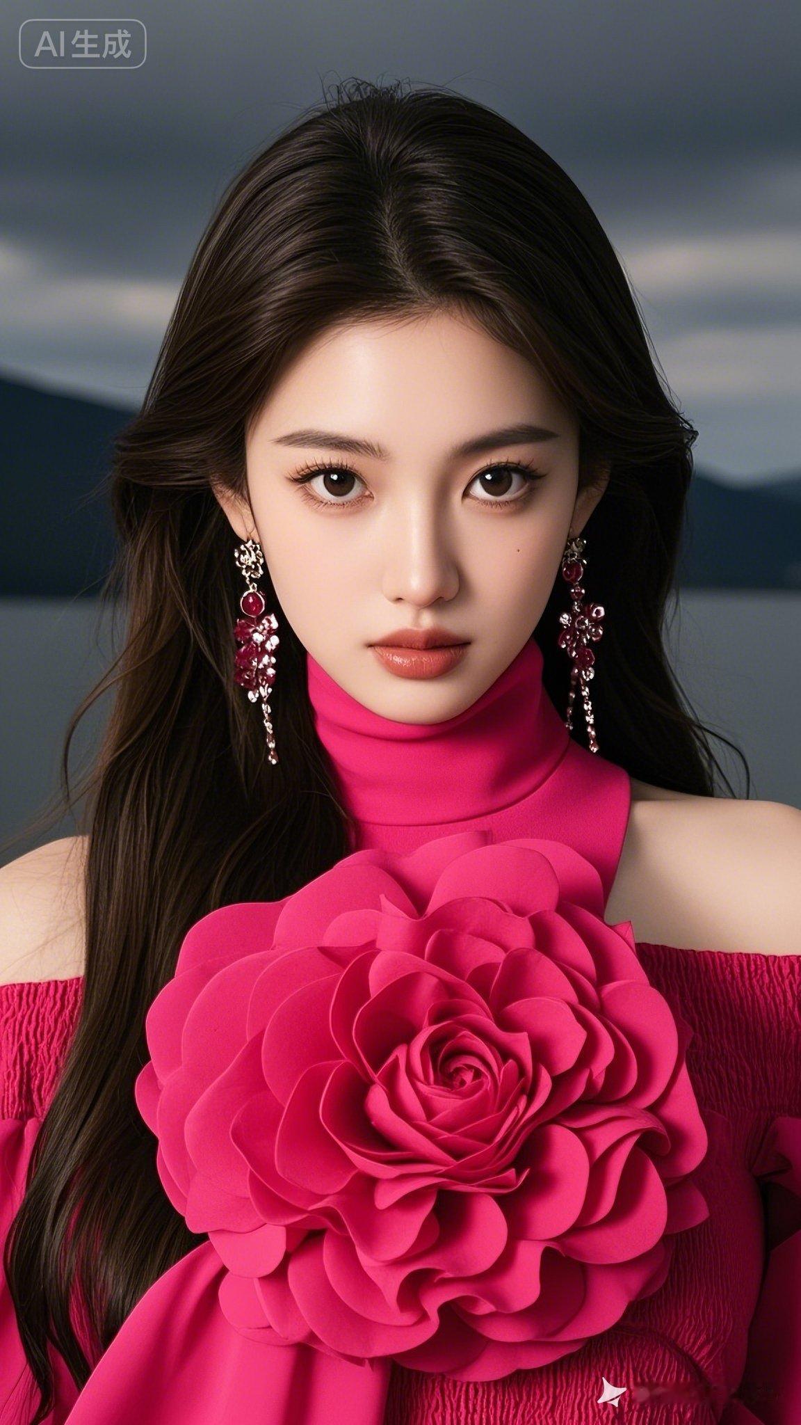 惊艳的粉色玫瑰与优雅黑发,AI生成的完美女神!