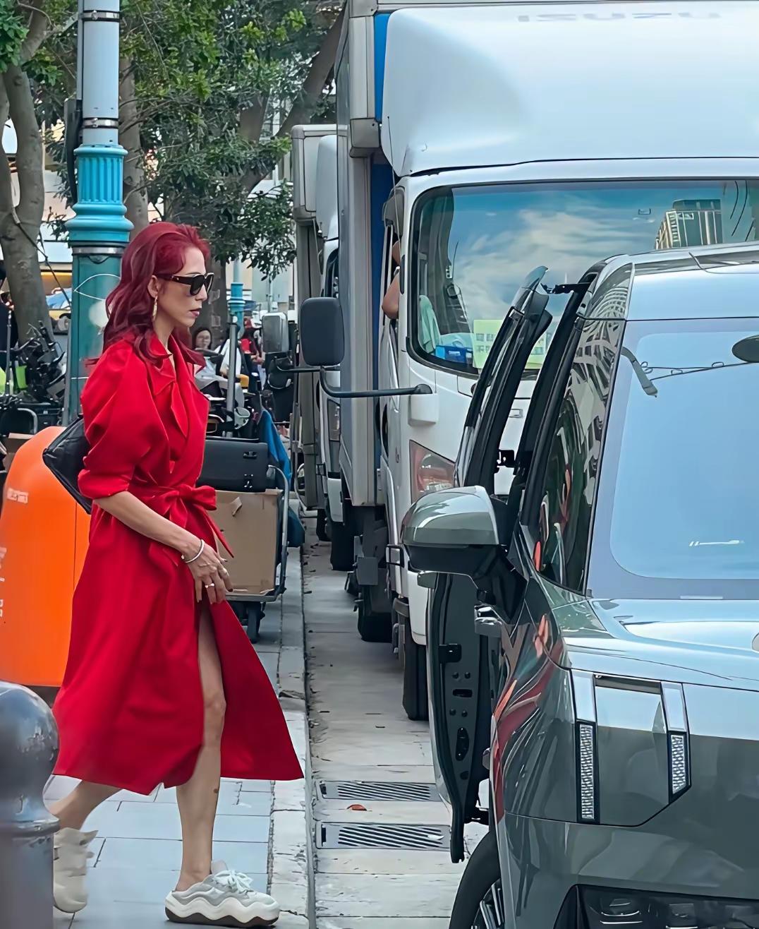 蔡少芬,红色头发配红色大衣好霸气。