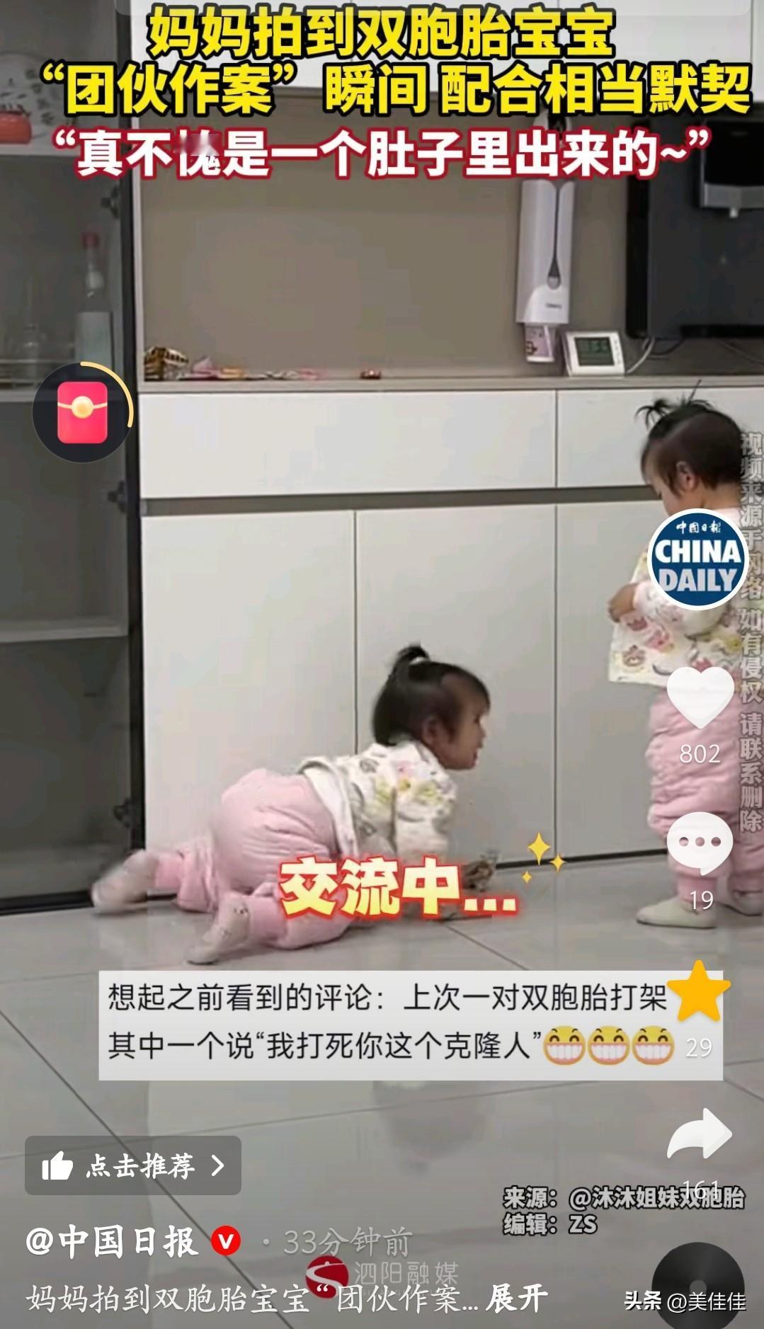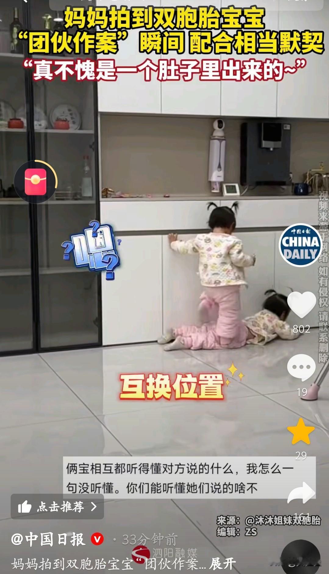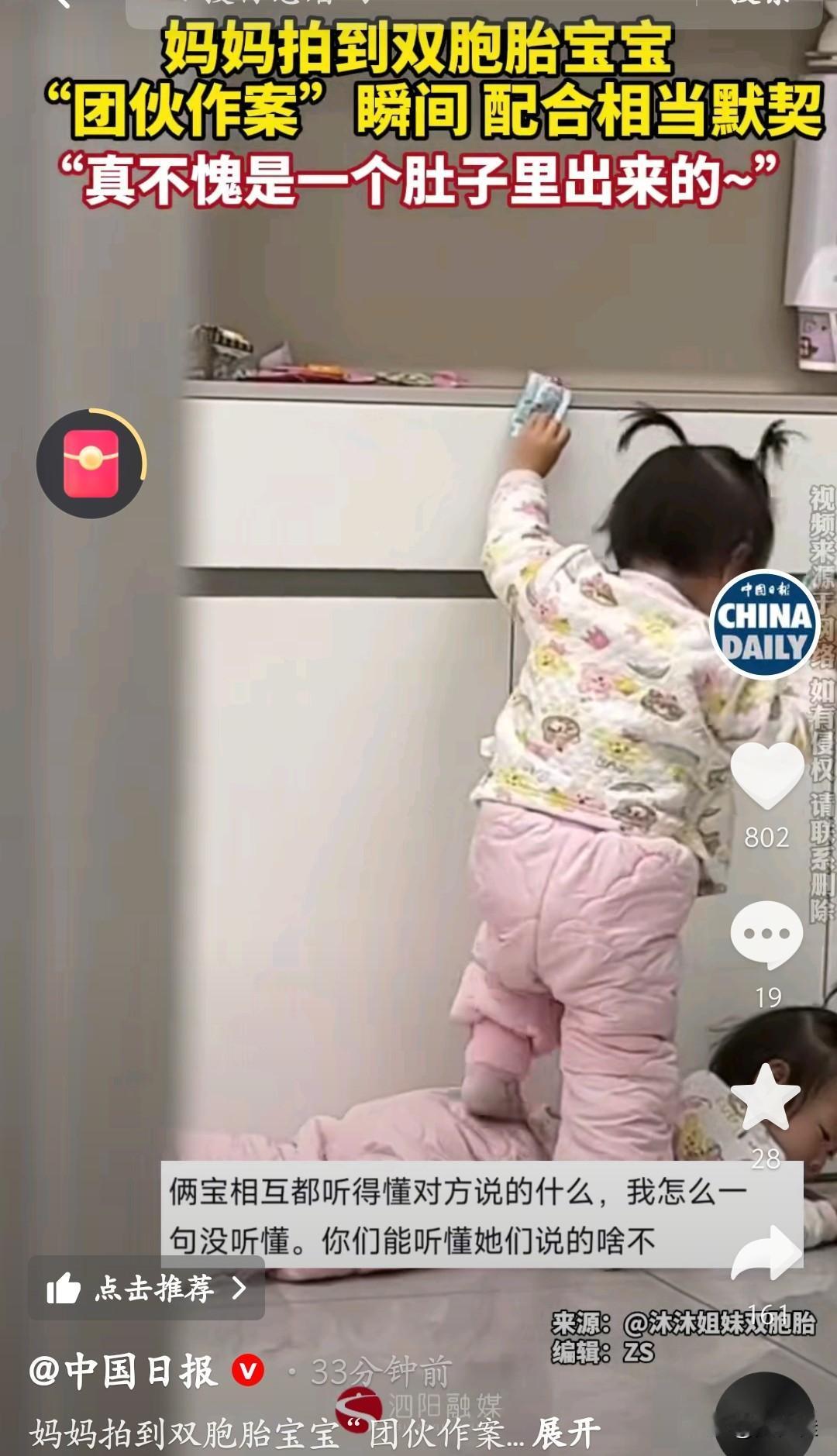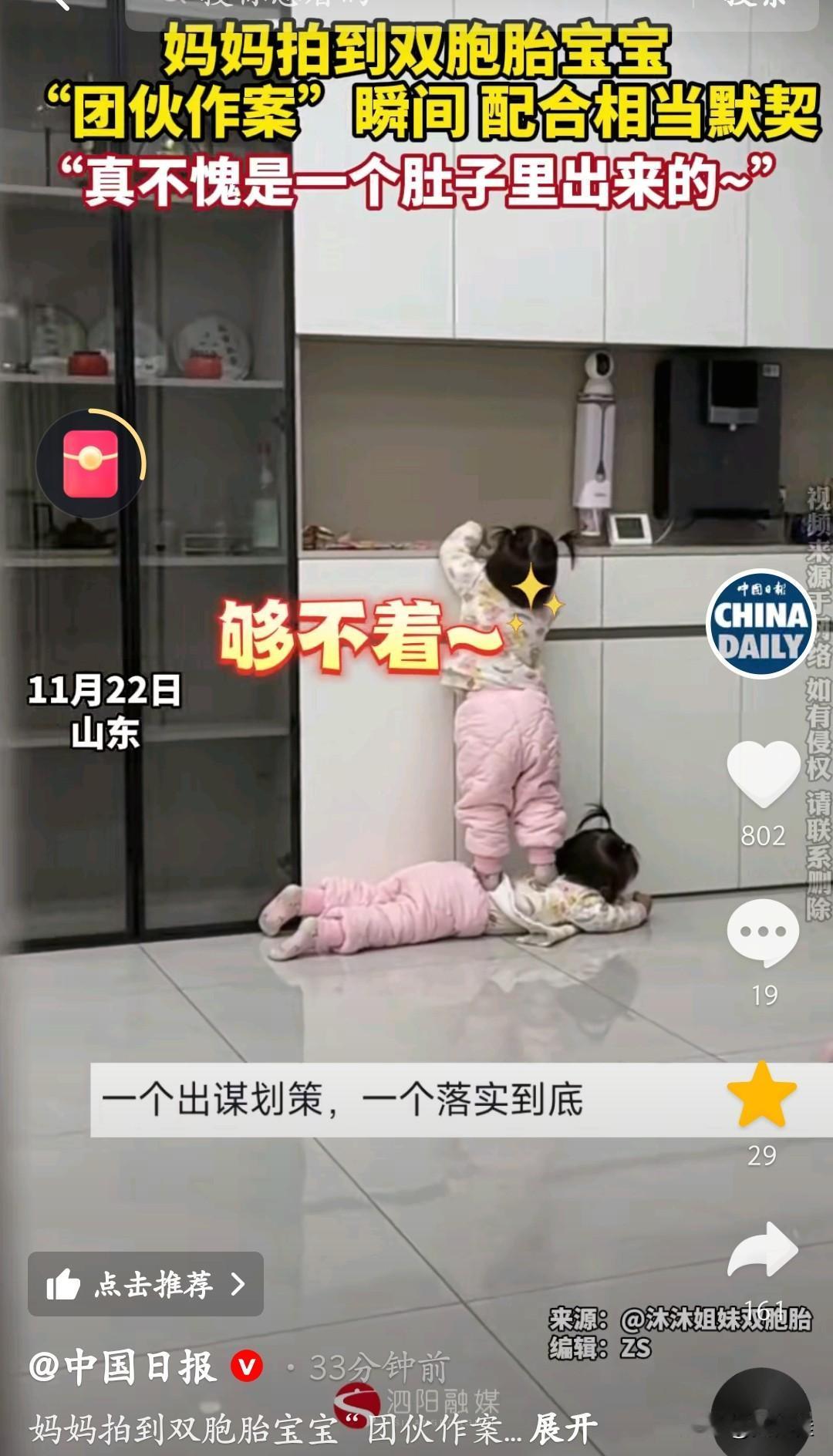 不愧是能上人民日报的双胞胎宝宝,团伙作案,分工明确! 一个甘愿当“人肉台阶”趴地上,一个踩着姐姐的背够东西,够不着还知道互换位置接着来,小模样配合得那叫一个默契。 俩娃还凑一块儿嘀嘀咕咕“交流战术”,主打一个心有灵犀,不愧是一个肚子里出来的。这小团伙的执行力,长大怕是没人能管得住咯!