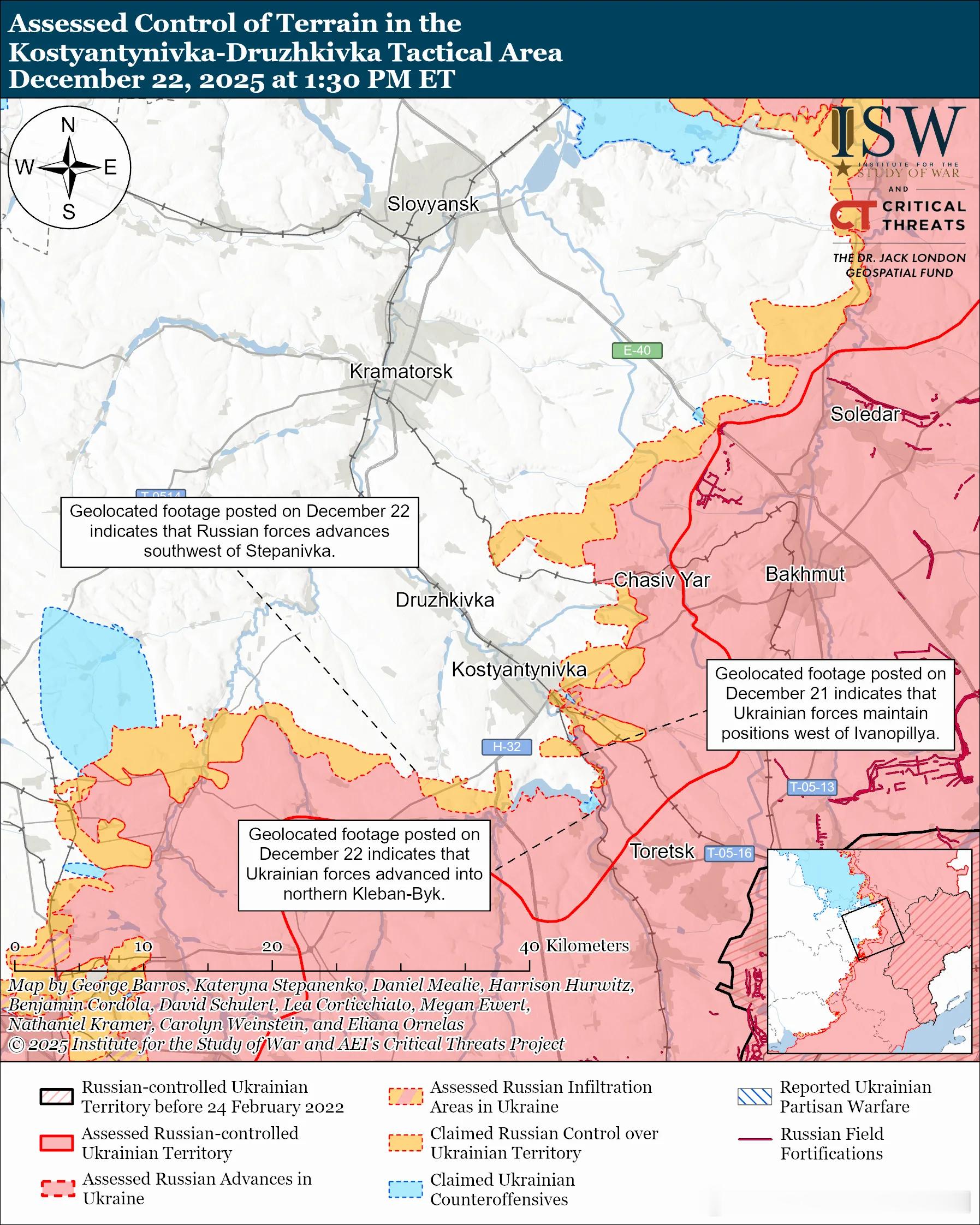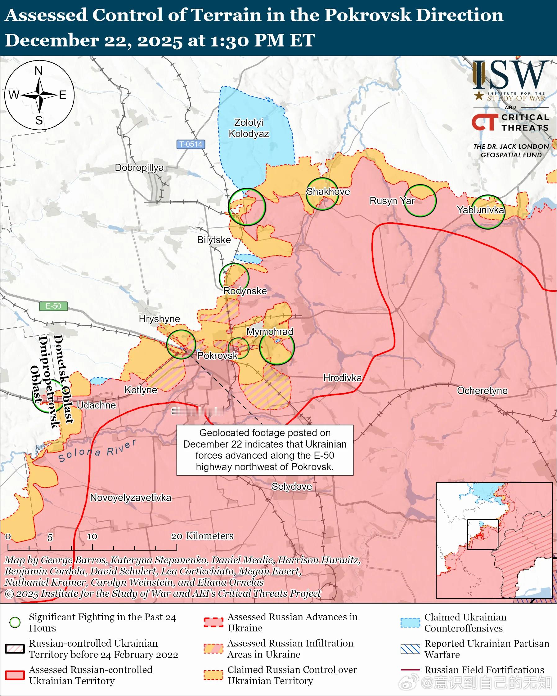俄军主要行动3俄军目标:占领顿涅茨克州全境,并向第聂伯罗彼得罗夫斯克州推进。12月22日俄军继续向锡维尔斯克方向发起进攻,但并未取得确切进展。未经证实的说法:一位俄罗斯军事博主声称,俄军向东、向西、向北推进至帕泽诺,向北推进至费多里夫卡(均位于锡维尔斯克西南)。12 月 21 日和 22 日,俄军在锡韦尔斯克附近、锡韦尔斯克西北部的迪布罗瓦、奥泽尔内、扬皮尔、德罗尼夫卡和扎基特涅附近、锡韦尔斯克东北部的谢列布良卡附近以及锡韦尔斯克西南部的帕泽诺附近发动了进攻。一支在锡韦尔斯克方向作战的乌军旅报告称,俄军正以小股步兵部队进攻谢列布里扬卡,并于近期试图使用装甲车辆将步兵运送至该地区的乌克兰阵地进行突击,但未成功。该旅报告称,俄军正试图从谢列布里扬斯克森林地区向西韦尔斯基顿涅茨河对岸增援部队,乌克兰军队于12月20日至22日期间摧毁了两艘俄军船只。该旅指出,俄军正试图占领谢列布里扬卡和德罗尼夫卡,以建立桥头堡,积蓄兵力和装备,从而进一步向扎基特涅和普拉托尼夫卡(锡韦尔斯克西北部)附近的高地推进。战斗序列:据报道俄第2炮兵旅(第3合成集团军,南部军区)正在扎基特涅打击乌克兰军队。第169摩步旅(第25合成集团军,中央军区)仍在扬皮尔附近作战。乌克兰和俄罗斯军队最近在科斯蒂安蒂尼夫卡-德鲁日基夫卡战术区取得了进展。评估乌克兰的进展:12 月 21 日发布的地理定位视频显示,乌克兰军队在克莱班-比克北部(科斯蒂安蒂尼夫卡东南部)取得了进展。ISW 评估认为,这一变化并非发生在过去 24 小时内。评估俄军的进展:12 月 22 日发布的地理定位视频显示,俄军向斯捷潘尼夫卡东南(科斯蒂安蒂尼夫卡西南)推进。未经证实的说法:俄罗斯米尔博主声称俄罗斯军队占领了奥里霍沃-瓦西利夫卡(Kostyantynivka 东北部);向科斯特扬提尼夫卡以东推进;奥里霍沃-瓦西利夫卡以北;奥列克桑德罗-卡利诺韦 (Oleksandro-Kalynove) 北部(科斯蒂安提尼夫卡 (Kostyantynivka) 南部); Pleshchiivka以西(Kostyantynivka东南);和 Novopavlivka 以南(Druzhkivka 西南)。俄罗斯声称占领的区域范围:12 月 21 日发布的地理定位视频显示,乌克兰军队在伊万诺皮利亚(科斯蒂安蒂尼夫卡东南)以西地区活动,而俄方此前声称俄军在该地区驻扎。俄军在科斯特扬季尼夫卡附近发动进攻; Kostyantynivka以北,靠近Virolyubivka;科斯蒂安提尼夫卡东北部,靠近明基夫卡和奥里霍沃-瓦西利夫卡; Kostyantynivka 以东,靠近 Oleksandro-Shultyne;位于 Kostyantynivka 东南部,靠近 Pleshchiivka、Shcherbynivka 和 Kleban-Byk; Kostyantynivka西南方向Stepanivka; Druzhkivka以南,靠近Rusyn Yar;在 Druzhkivka 西南部靠近 Sofiivka 的地方。12月22日一名在莱曼方向作战的乌克兰无人机部队军官报告称,俄军正利用恶劣天气向莱曼和斯维亚托希尔斯克(莱曼西北部)推进,以期接近克拉马托尔斯克和斯拉维扬斯克。12月22日一名俄罗斯军事博主声称,俄军尚未完全控制普列德捷奇涅(科斯蒂扬尼夫卡以东)。作战序列:俄第103摩步团(第150摩步师,第8集团军)及其第4突击营的(FPV)无人机操作员正在伊万诺皮利亚以西(科斯蒂安蒂尼夫卡东南)、克莱班-比克水库以北(科斯蒂安蒂尼夫卡以南)和普列什奇伊夫卡以西袭击乌克兰军人。鲁比孔先进无人技术中心的FPV无人机操作员正在罗兹基什内附近(科斯蒂安蒂尼夫卡以西)袭击乌克兰部队。12月22日俄军继续在多布罗皮利亚战术区开展进攻行动,但并未取得进展。12月21日和22日,俄军在多布罗皮利亚东部的沙霍韦和新沙霍韦附近以及多布罗皮利亚东南部的扎波维德涅和多罗日涅附近发动进攻。作战序列:据报道俄第102摩步团(第150摩步师)的FPV无人机操作员正在托列茨克(多布罗皮利亚以东)附近袭击乌克兰军队。第174独立侦察营(第150摩步师)和第33摩步团(第20摩托化步兵师,第8集团军)继续在多布罗皮利亚方向作战。乌克兰军队最近向波克罗夫斯克方向推进。评估乌克兰的进展:12 月 22 日发布的地理定位视频显示,乌克兰军队沿着波克罗夫斯克西北部的 E-50 波克罗夫斯克-巴甫洛格勒公路推进。俄军在波克罗夫斯克附近发动进攻;波克罗夫斯克西北部,靠近赫里什涅;波克罗夫斯克以北,靠近罗登斯克;波克罗夫斯克东北部,靠近罗夫诺和苏赫茨克;波克罗夫斯克以东,靠近米尔诺赫拉德;波克罗夫斯克西南部靠近科特林、乌达奇内、新皮德霍罗德涅和莫洛杰茨克,以及谢尔希夫卡方向。乌克兰空降突击部队第7快速反应军发言人弗拉基米尔·波列维于12月22日报告称,乌克兰军队正在波克罗夫斯克市内使用轻武器与俄军交火,俄军已在该市设立无人机操作员阵地。发言人表示,俄军正以道路和隧道为目标,切断乌克兰的后勤补给。波列维报告称,乌克兰军队在过去一周(12月15日至22日)造成俄军373人伤亡,截至12月22日,在军区责任区内,俄军在2025年12月已累计伤亡1243人。波列维补充说,乌克兰军队控制着波克罗夫斯克北部地区,并且仍然能够在波克罗夫斯克进行轮换部署。乌克兰东部集团军发言人格里戈里·沙波瓦尔上尉报告称,俄军主要以小股突击队的形式试图渗透乌克兰防线,并且在格里申内西部郊区最为活跃。沙波瓦尔表示,乌克兰军队击退了俄军近期多次摩托车突袭,并摧毁了乌克兰怀疑俄军计划用于发动机械化突击的大量装甲车辆。一位俄罗斯军事博客作者声称,俄军控制了米尔诺赫拉德约30%