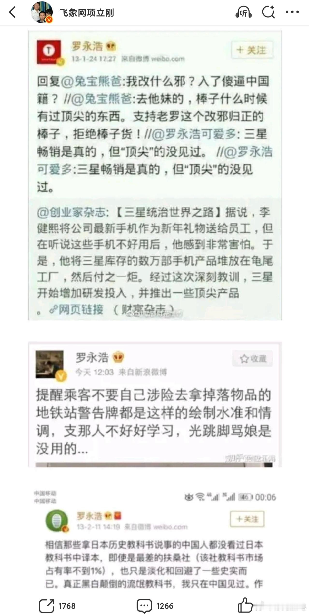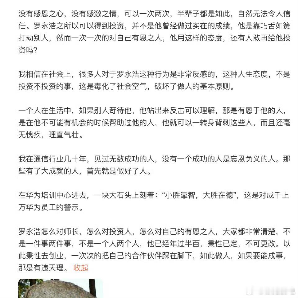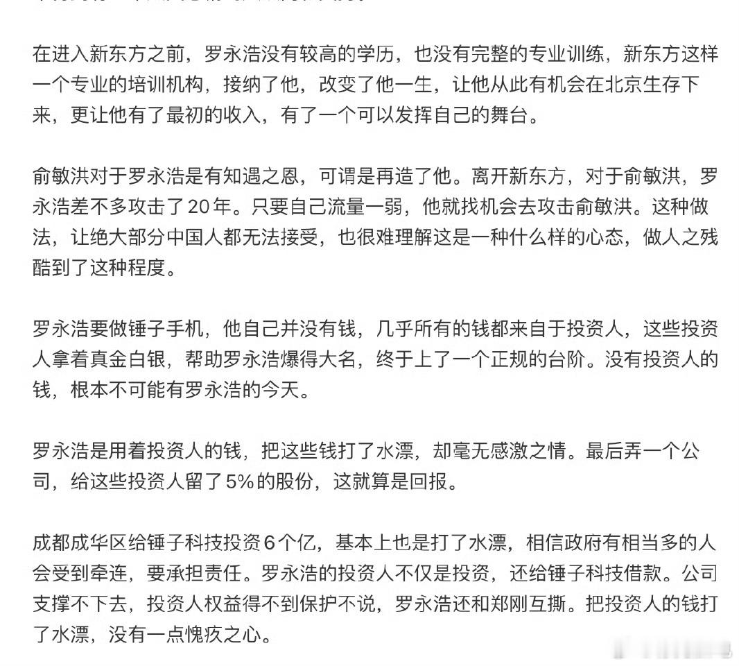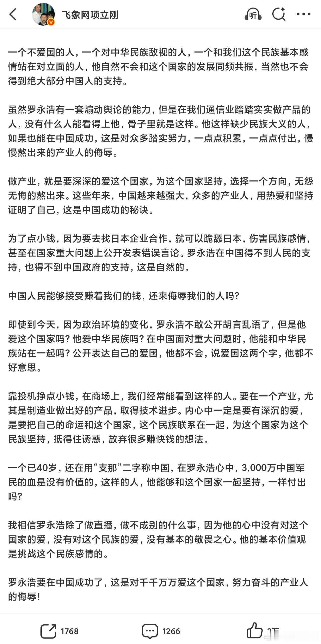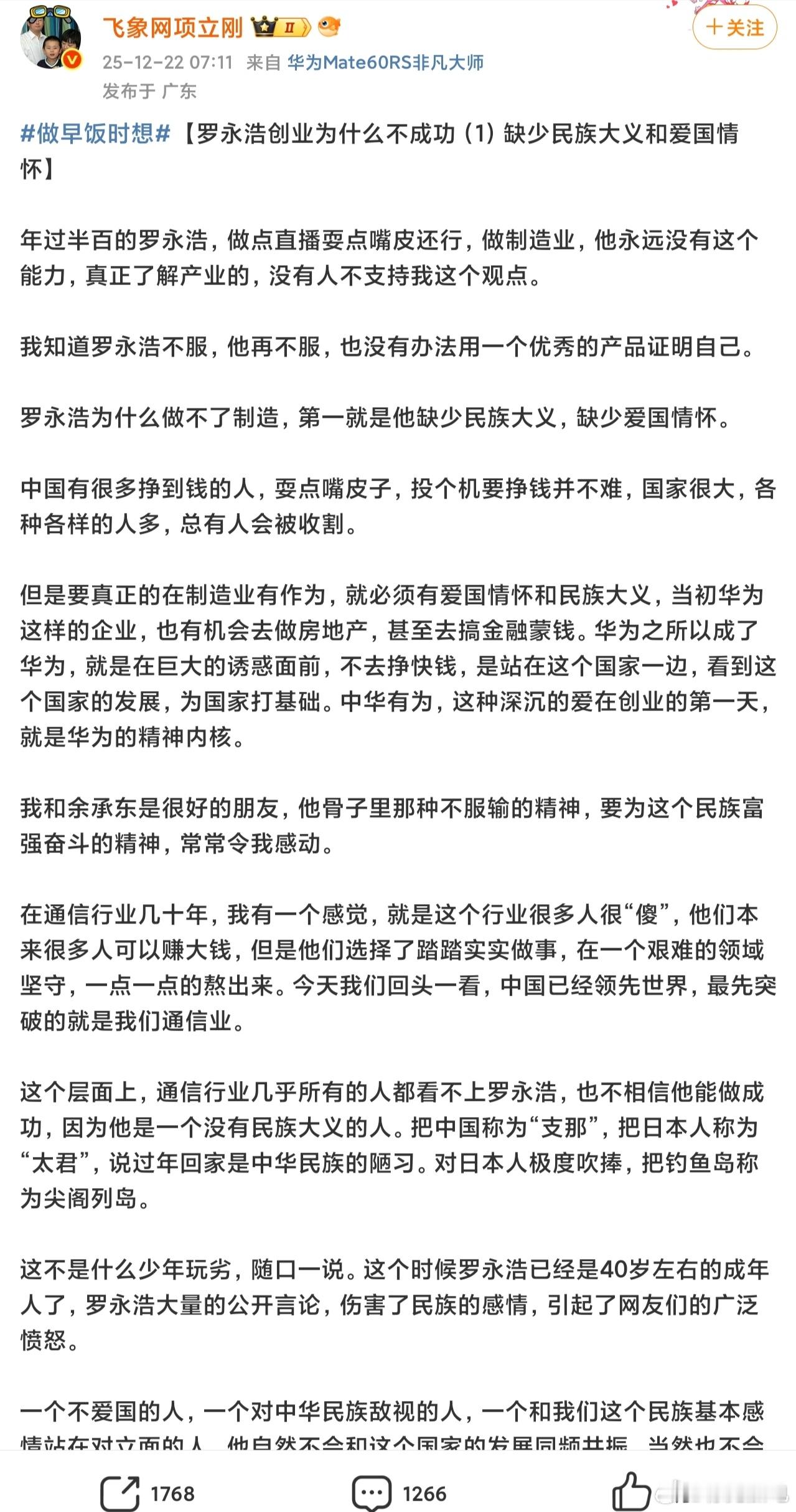 整成特辑了,项立刚的输出火力也是很猛呀,最聪明是带上了华为,让罗永浩无力还口。总结一下,第一篇,攻击点在于,罗永浩缺乏民族大义,会耍嘴皮子,缺乏爱国情怀,吹捧日本等,扣帽子不少呀。第二篇,攻击点在于,缺乏感恩之情,巧舌如簧,背刺他人。第一篇比较敏感,关于日本啥的,都是一些陈年旧事,现在拿出来有点过分了。这两篇博文,大概率已经很大程度的激怒了罗永浩,因为罗永浩重来没打过这么窝囊的仗,基本所有的公开互怼,都是罗永浩占据主动权。我认为项立刚最聪明地方是带上了华为,有可能是想带动一些粉丝给自己站台,罗永浩不敢惹华为,估计这也是罗永浩目前还没回应的原因。罗永浩可能需要思考一下怎么应对,且避开惹到某些群体。至于,项立刚的内容,可圈可点,有点过于道德绑架了。成就上,罗永浩肯定比项立刚更成功,作为网红,两个都是嘴皮子成就,半斤八两,谁也别瞧不起谁。