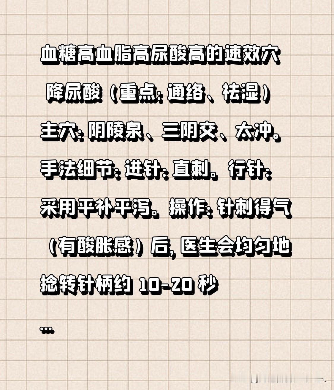 血糖高血脂高尿酸高的速效穴 💧 降尿酸(重点:通络、祛湿) 主穴:阴陵泉、三阴交、太冲。 手法细节: 进针:直刺。 行针:采用平补平泻。 操作:针刺得气(有酸胀感)后,医生会均匀地捻转针柄约 10-20 秒,或者配合小幅度的提插,让针感持续。 技巧:在太冲穴,可以适当增加“泻法”的成分(力度稍大),以疏泄肝经的郁结。 🩸 降血脂(重点:化痰、活血) 主穴:丰隆、足三里、内关。 手法细节: 进针:直刺。 行针:泻法或平补平泻。 操作:丰隆穴是祛痰要穴,针刺时刺激量可以稍大。医生可能会使用强捻转法,或者提插法,让针感强烈一些,甚至传导到脚趾,以达到“通络化痰”的效果。 技巧:足三里通常用补法(轻柔捻转),以强壮身体;丰隆用泻法(强刺激),一补一泻,调节代谢。 🍬 降血糖(重点:滋阴、补肾) 主穴:三阴交、太溪、然谷。 手法细节: 进针:直刺。我 行针:补法为主。 操作:手法要轻柔、缓慢。捻转的角度较小,频率较慢,留针时间相对较长(通常 30 分钟以上),让身体慢慢吸收“阴气”。 在太溪穴(肾经原穴),要小心翼翼地进针,得气后轻轻捻转,意在“引气归元”。 高尿酸血症 尿酸高