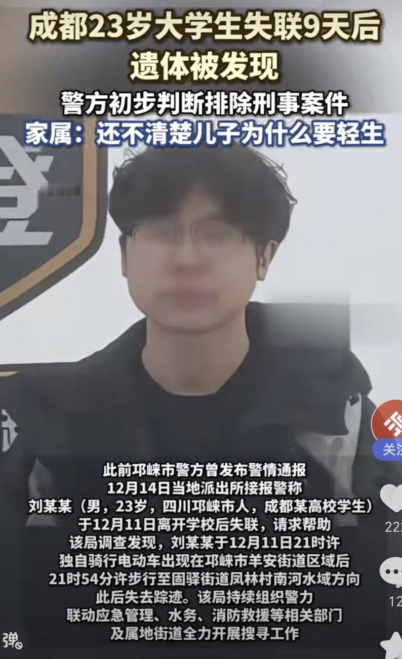 23岁本是青春正好、未来无限的年纪,成都这位大学生刘某某却不幸遇难。12月11日他离开学校后失联,警方通过调查发现他21时54分许步行至固驿街道凤林村南河水域方向后失去踪迹。之后警方联动多部门全力搜寻。12月20日发现了他的遗体,23日警方确认其遇难且初步判断排除刑事案件。如今他的家属正处理后续事宜。 A网友:兄弟可惜了啊,我大学挂了13科,赶在答辩前全过了,然后答辩还挂了,都是二辩过的,不是一样好好的工作结婚成家买房生子,回头看就是屁大点事。 B网友:我表弟今年28岁,现在就是一个普通的外卖员,已婚,生有一儿一女,老婆是隔几条巷子的邻居。他说当年在大学里因沉迷游戏而挂科被劝退,恍惚间在教学楼顶坐了一夜,总算没有跳下去,现在回想起来,真不是什么大事。 C网友:活着有这么多压力和痛苦吗?不是还可以摆烂躺平吗?这么好的年龄太可惜了,同时家长也要多关注孩子的心理健康。 这一悲剧让人痛心,也提醒着大家生命脆弱,要珍惜当下,也希望每个人都能被生活温柔以待。