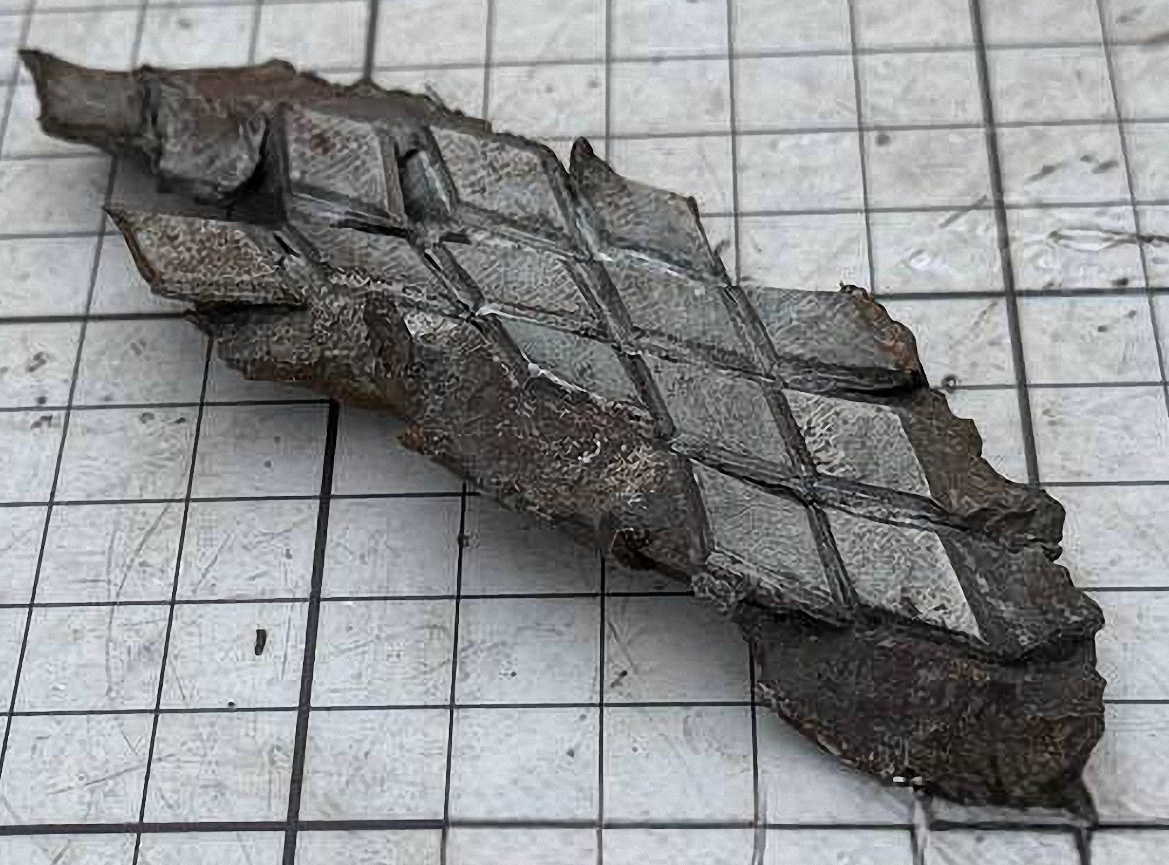 海马斯M30/M31单一战斗部爆炸后的破片,战斗部内壁刻有网格沟槽,产生菱形预控破片,可见有连片现象,预制破片可以弥补,当然预制破片战斗部也有缺点,破片的初速不如预控破片、自然破片