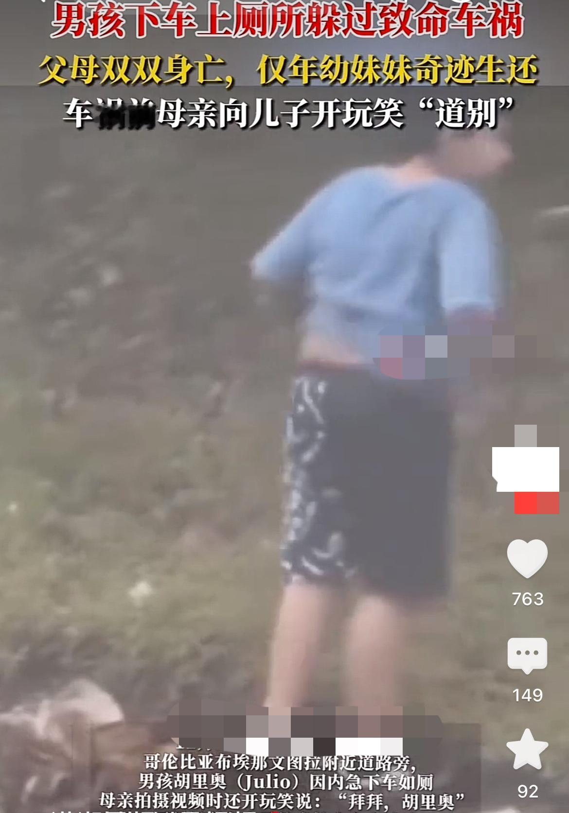 男孩下车上厕所躲过致命车祸!母亲一句“拜拜”竟成诀别? 在哥伦比亚布埃那文图拉附近的一条公路边,一个叫胡里奥的小男孩因为内急,从自家轿车上下来去上厕所。母亲当时还拿着手机拍视频,对着儿子开玩笑地说了句“拜拜,胡里奥”。这原本是旅途中最普通不过的一个瞬间,一句轻松的玩笑话。 谁也没想到,这声“拜拜”竟然成了与孩子的诀别。就在胡里奥离开车辆后不久,一辆疑似刹车失灵的半挂卡车,以极快的速度从后方猛烈撞上了他们停在路边的轿车。撞击如此惨烈,坐在车内的父母当场不幸身亡。而刚刚因为上厕所离开车辆的胡里奥,阴差阳错地不在车内,奇迹般地逃过了这场劫难。车里还有他年幼的妹妹,由于体型较小,在巨大的撞击中被安全装置缓冲,仅仅受了轻伤,也幸存了下来。 生命的无常与脆弱,在这起事件中展现得淋漓尽致。您如何看待这场令人心碎的意外?对于道路安全与命运的偶然,有什么想说的? [免责声明] 文章的时间、过程、图片均来自于网络,文章旨在传播正能量,均无低俗等不良引导,请观众理性看待本事件,切勿留下主观臆断的恶意评论,互联网不是法外之地。本文如若真实性存在争议、事件版权或图片侵权问题,请及时联系作者,我们将予以删除。