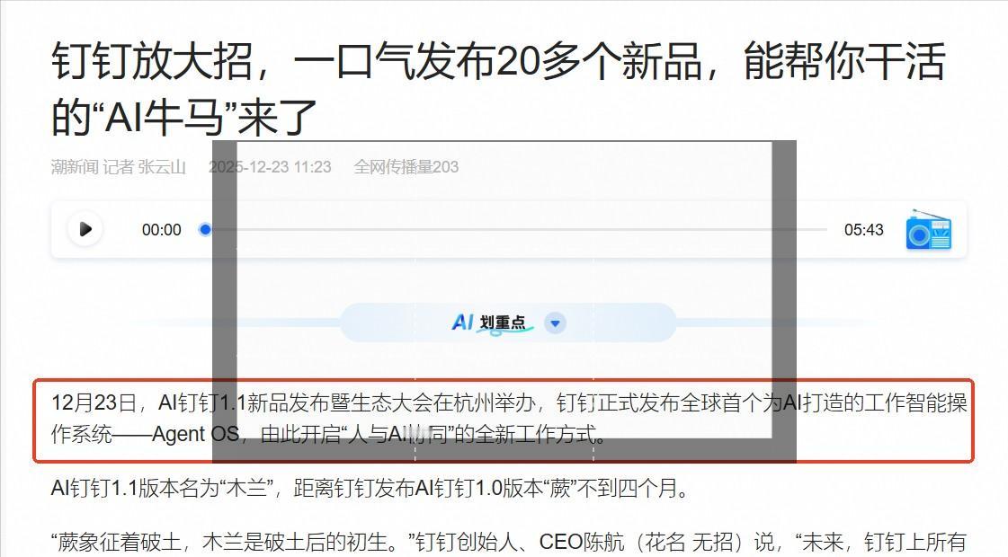 *2025即将结束,阿里却在今天的发布会上扔下了一枚“震撼弹”——全球首个为AI打造的工作操作系统,正式亮相! 很多人可能会撇撇嘴:这不就是个新软件吗,还真不是这么简单。 咱们拿大白话来讲,以前大家用的AI工具,就像一群各干各的临时工,翻译有翻译的工具、处理文档有文档的工具,用的时候得一个个调,还互相不搭界。 但阿里这个AI工作操作系统,相当于给所有AI找了个“大管家”,不管是语音识别、图片处理还是数据整理,所有AI工具都能在这上面协同干活,还能直接对接咱们平时的工作场景,不用再费劲琢磨怎么适配。 钉钉负责人在发布会上说得挺实在:以后不管什么AI助手,都能在这个系统上跑,让AI真能跟上大家实际干活的流程。 大家平时干活都能感觉到,2025年的AI早就不是实验室里的新鲜玩意儿了。 工厂里的机器人、公司里的智能客服、手机上的语音转文字,越来越常用,但麻烦也跟着来,以前的操作系统都是给电脑、手机设计的,面对这些需要实时反应、还得在没网的时候也能用的AI设备,就显得特别“吃力”。 就像用老款手机装新APP,不是用不了,就是卡顿、反应慢,效率低得让人着急。 这也是为啥现在国内外科技公司都在抢这个赛道,有的做机器人专用系统,有的往AI适配方向靠,而阿里这次直接把“AI工作操作系统”亮出来,相当于在这个新赛道上先跑了一步。 说了这么多,这系统到底能帮大家干点啥,咱不说虚的,就说日常能用到的场景。 职场人最头疼的文档处理,以前扫描发票、提取合同里的关键信息,得手动对着敲,错一个字都得返工。 现在用这个系统,不管是中文合同、英文票据,甚至手写的笔记,都能自动把有用的信息提出来,还能自动整理归档,不用再对着屏幕熬夜。 做小生意、开网店的更省心,想给产品抠图、调色,或者做个宣传小视频,不用再找设计帮忙等半天,系统里的工具一键就能搞定,连发丝那么细的抠图都能做到。 更方便的是团队干活,开个会不用专人记笔记,系统能自动转写还纠错,会后直接分配任务、跟踪进度,以前几个人几天干的活,现在几小时就能搞定。 这背后其实是阿里攒了很多年的本事,这个系统靠的是阿里云的基础支撑,还整合了语音识别、文字处理、图片智能这些全套AI能力,就像给AI搭了个“万能工作台”。 比如语音转写,开会时说的话能实时变成文字,还能自动区分谁讲的,有错别字也能自动改,翻译功能更实用,几十种语言都能转,不管是证件上的文字还是图片里的内容,拍一下就能翻译,做跨境生意的不用再反复核对。 最贴心的是没网的时候也能用核心功能,数据都在自己设备上处理,既不耽误干活,也不用担心信息泄露,这些能力都是阿里在电商、办公这些场景里摸爬滚打多年攒下来的,现在打包成了大家都能用的系统。 现在AI竞争早就不是单个工具比谁厉害,而是看能不能凑在一起帮大家解决实际问题。 国内外不少科技公司都在布局,但阿里的优势在于,系统里已经有2000多个行业能用的模型,不管是政府办公、电商运营还是小店管理,拿来就能用,不用再花大价钱定制。 就像很多地方用智能工具处理政务,接线效率、公文处理速度都明显提高,阿里这套系统就能把这种方便复制到更多行业,不管是大公司还是小店铺,都能用上靠谱的AI工具。 可能有人会担心:这么厉害的系统,会不会让很多人失业? 其实真不用怕。就像以前电脑、互联网没取代人,反而多了很多新工作一样,这个AI系统是把大家从重复的活儿里解放出来。 比如做审计的,不用再对着一堆数据反复核对,AI能自动找问题,人就能专心做更复杂的分析;老师不用再熬夜批改作业、写教案,AI能帮忙搞定,就能多花时间陪学生。 说白了,它不是抢工作,而是让大家不用再干机械重复的活,能做更有价值的事。 2025年底这场发布会,与其说是阿里发了个新产品,不如说AI终于要真正融入咱们的工作了。 以前聊AI,总说技术多先进、参数多厉害,但普通人感觉不到,现在不一样了,这个系统解决的是大家干活时的痛点——工具不配合、操作复杂、效率低。 当所有AI工具都能无缝协作,不管是大公司还是小个体户,都能轻松用上AI,这场效率革命才算真的来了。