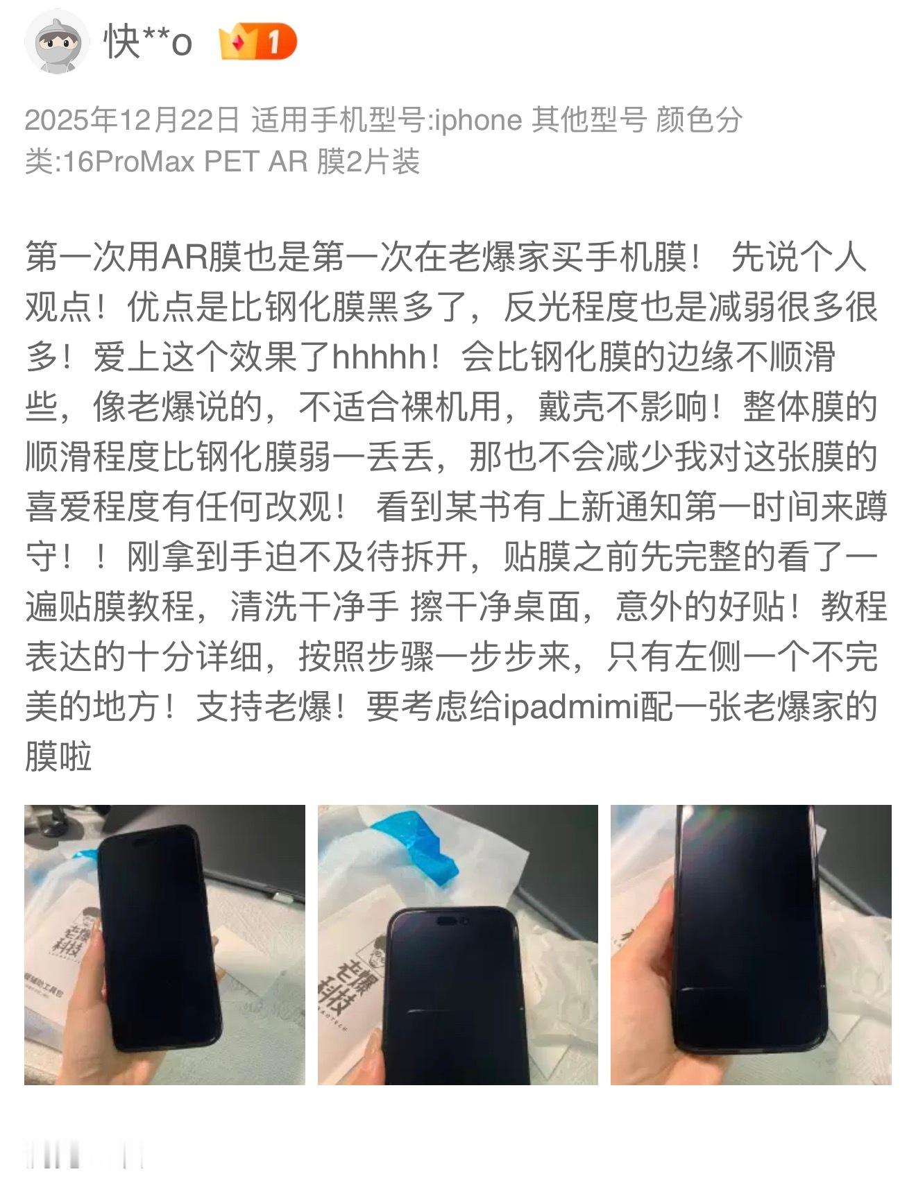 Pet AR 膜应该不少朋友已经用上了,来说说感受这个软膜是不是跟传统认知的软膜不太一样?顺滑度是不是比玻璃膜逊色一些,但也还算顺滑?是不是不耐刮?是不是极致轻薄?抗反射是不是很牛?是不是边缘刮手?是不是覆盖不大?