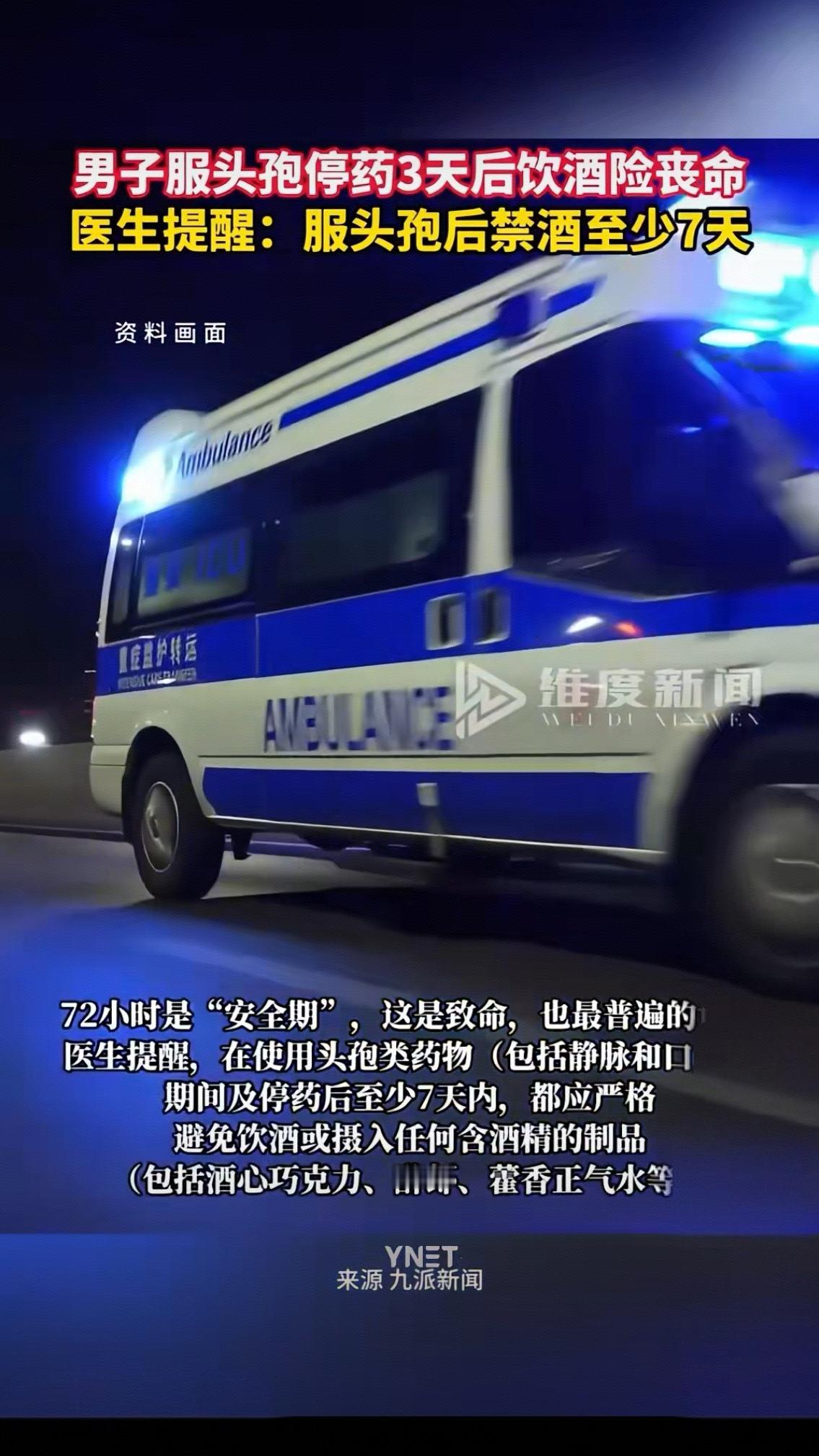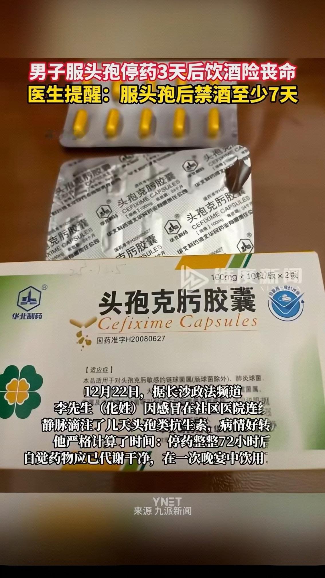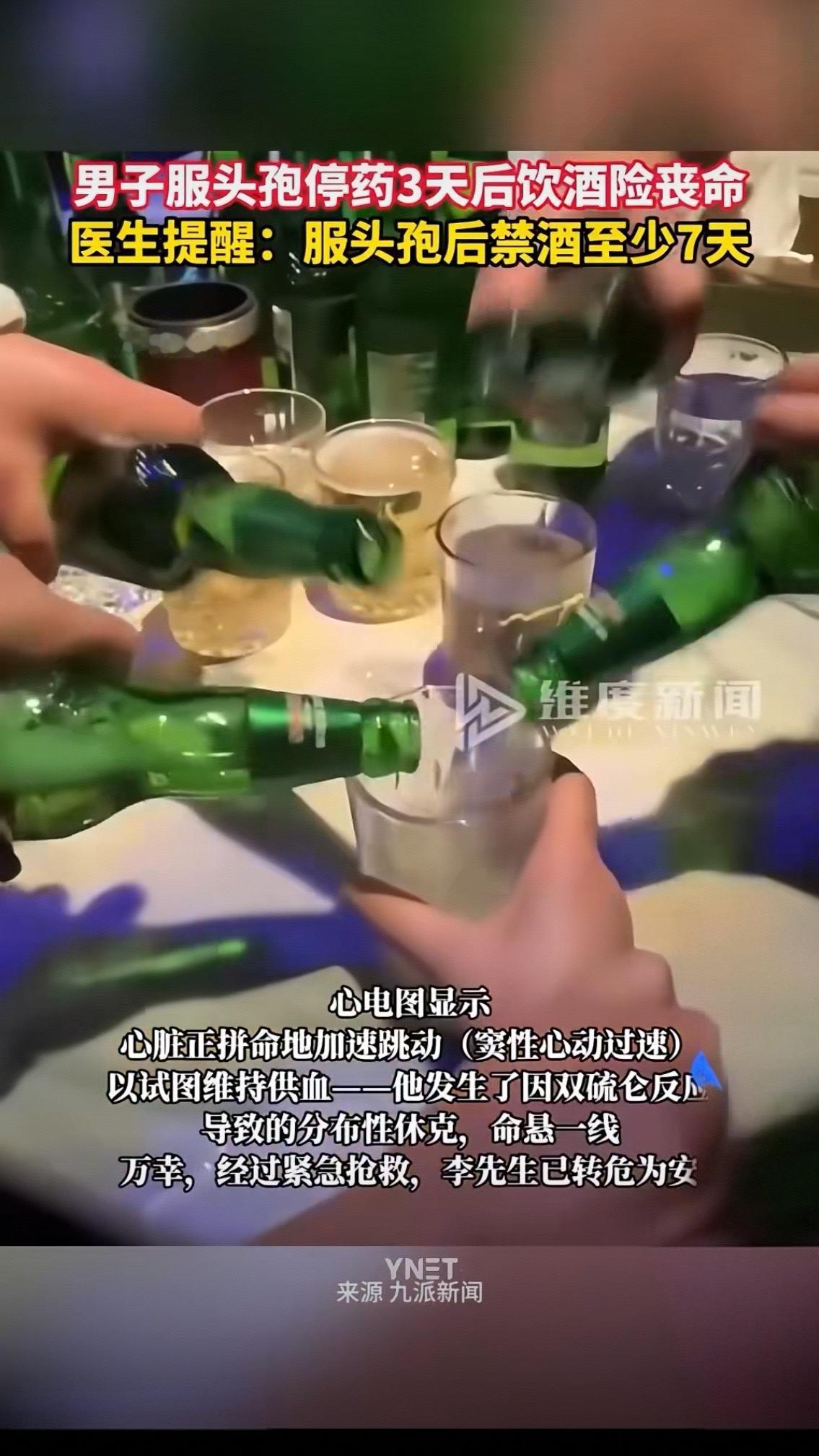 男子服头孢停药3天后饮酒险丧命 医生提醒:服头孢后禁酒至少7天 12月22日,据长沙政法频道报道,李先生(化姓)因感冒在社区医院连续静脉滴注了几天头孢类抗生素,病情好转,他严格计算了时间:停药整整72小时后自觉药物应已代谢干净,在一次晚宴中饮用了白酒。 谁能想到,酒杯刚放下没半小时,李先生就突然面色潮红、头晕胸闷,紧接着呼吸困难、恶心呕吐,整个人直接瘫软在椅子上,旁边的亲友吓得魂飞魄散,手忙脚乱地把他送进急诊。经过医生的紧急抢救,李先生才从鬼门关捡回一条命。事后医生直言,他这是典型的双硫仑样反应,头孢类药物会抑制体内酒精的代谢,哪怕停药3天,药物残留依然会和酒精发生剧烈反应,严重时会导致呼吸衰竭、心跳骤停。 “就隔了72小时,怎么还会出事?”躺在病床上的李先生又后怕又疑惑。其实这不是个例,生活里太多人像他一样,抱着“停药两三天就没事”的侥幸心理,最终酿成大祸。有人觉得自己身体好,喝一点没关系;有人应酬推不掉,硬着头皮端酒杯;还有人根本不知道头孢和酒是“致命组合”。 可在健康面前,哪有什么侥幸可言?医生再三强调,服头孢后禁酒至少7天,这不是一句轻飘飘的提醒,而是用血的教训换来的铁律。药物代谢速度因人而异,年纪、体质、肝肾功能都会影响进程,我们根本没法精准判断体内药物是否完全排净。 这场惊魂一幕,更该给所有人敲响警钟。生病吃药从来不是“完成任务”,而是对自己生命负责的大事。别让一时的疏忽和侥幸,毁掉一个家庭的幸福。 评论区聊聊吧,你身边有没有人不知道头孢禁酒的禁忌?你有没有过差点踩坑的经历?