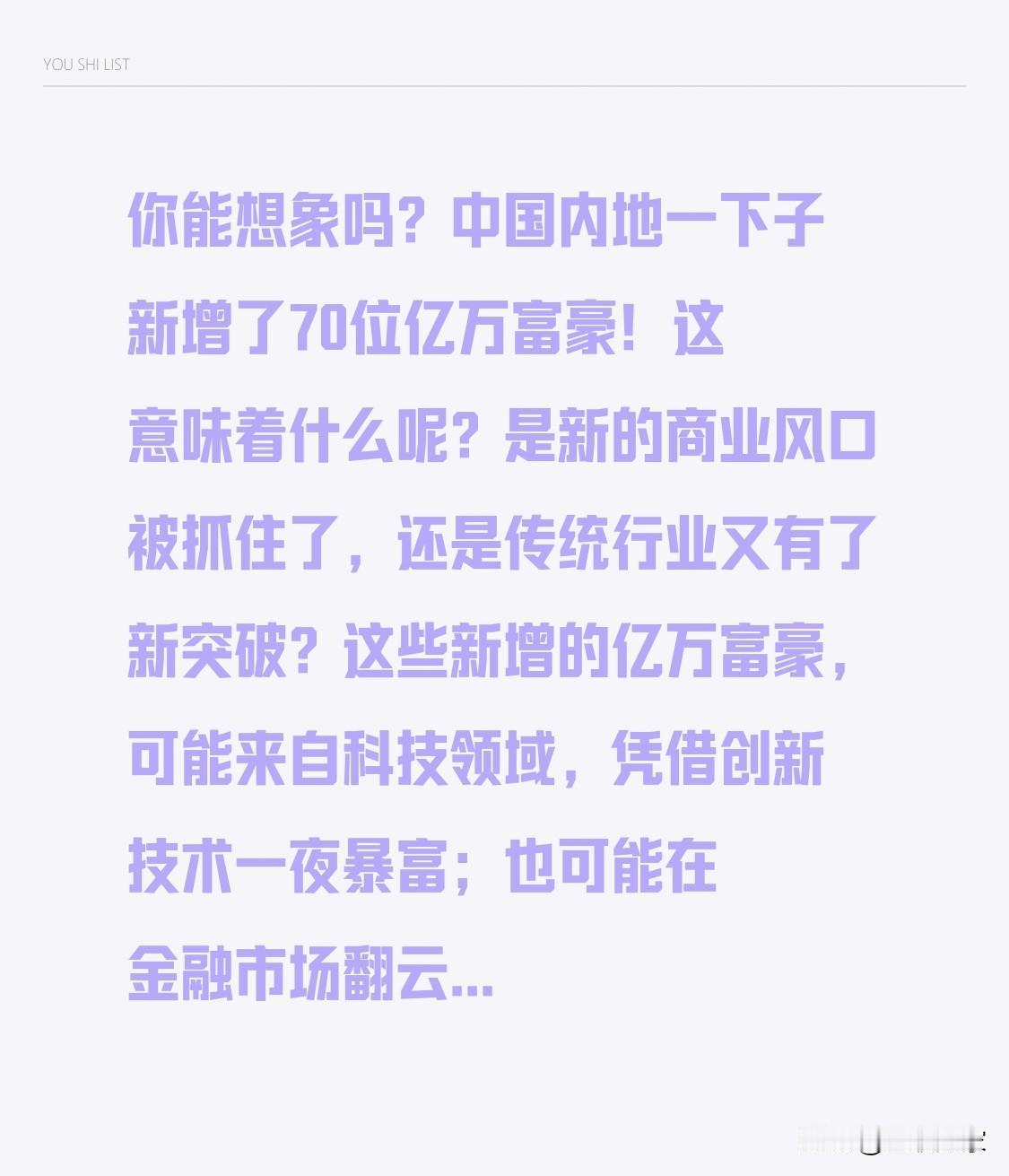 你能想象吗?中国内地一下子新增了70位亿万富豪!这意味着什么呢?是新的商业风口被抓住了,还是传统行业又有了新突破? 这些新增的亿万富豪,可能来自科技领域,凭借创新技术一夜暴富;也可能在金融市场翻云覆雨,积累了巨额财富。说不定他们中有白手起家的创业者,从一间小办公室开始,一步步打造出商业帝国;也有在传统制造业深耕多年,终于迎来收获的企业家。 这70位新增富豪的背后,藏着多少不为人知的故事和机遇呢?大家觉得这些富豪的成功,是时代的馈赠,还是个人努力的必然?未来还会有哪些领域涌现更多的亿万富豪?你身边有没有可能出现下一个亿万富豪? 富豪 亿万富豪排行榜 超级富豪排行 十大富豪排行 十大富豪 亿万富豪排行榜 超级富豪排行 十大富豪排行 全球富豪排名 十大富豪 这就是富豪榜 国内富豪